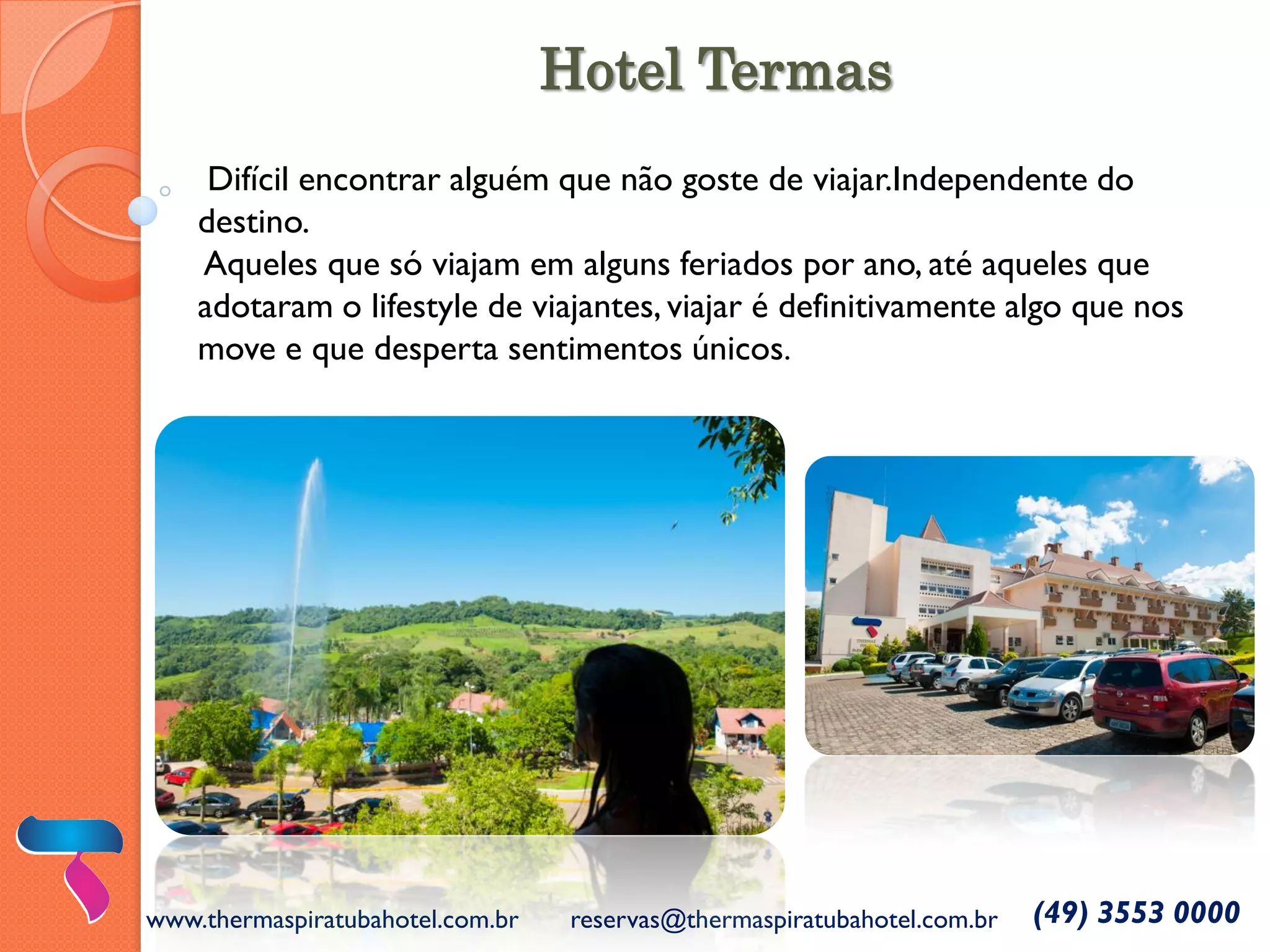 O documento descreve o Hotel Termas Piratuba Park localizado em Piratuba, Santa Catarina, uma cidade termal, destacando que viajar para o hotel trará novas experiências e sentimentos, já que o descanso e bem-estar são essenciais para uma vida saudável.