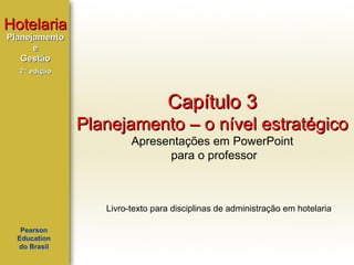 Este documento resume um capítulo de um livro sobre planejamento e gestão em hotelaria. O capítulo discute os conceitos de planejamento estratégico, tático e operacional, as etapas do processo de planejamento estratégico e a análise macroambiental externa e interna realizada durante a fase de diagnóstico do planejamento.