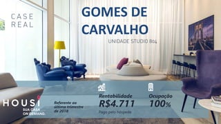 O documento apresenta dados de rentabilidade de propriedades alugadas no último trimestre de 2018, destacando receitas e taxas de ocupação. Entre elas, a rentabilidade variou de R$4.500 a R$5.500, com a maioria das propriedades alcançando ocupação total ou quase total. As informações são específicas para cada localidade mencionada, como Gomes de Carvalho, Ferreira Lobo e outros.
