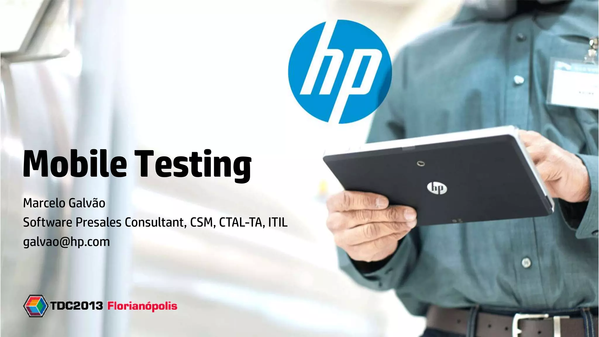 O documento discute os desafios do desenvolvimento e teste de aplicações móveis, apresentando a solução da HP para testes funcionais, de performance e segurança em dispositivos móveis de forma automatizada e na nuvem.