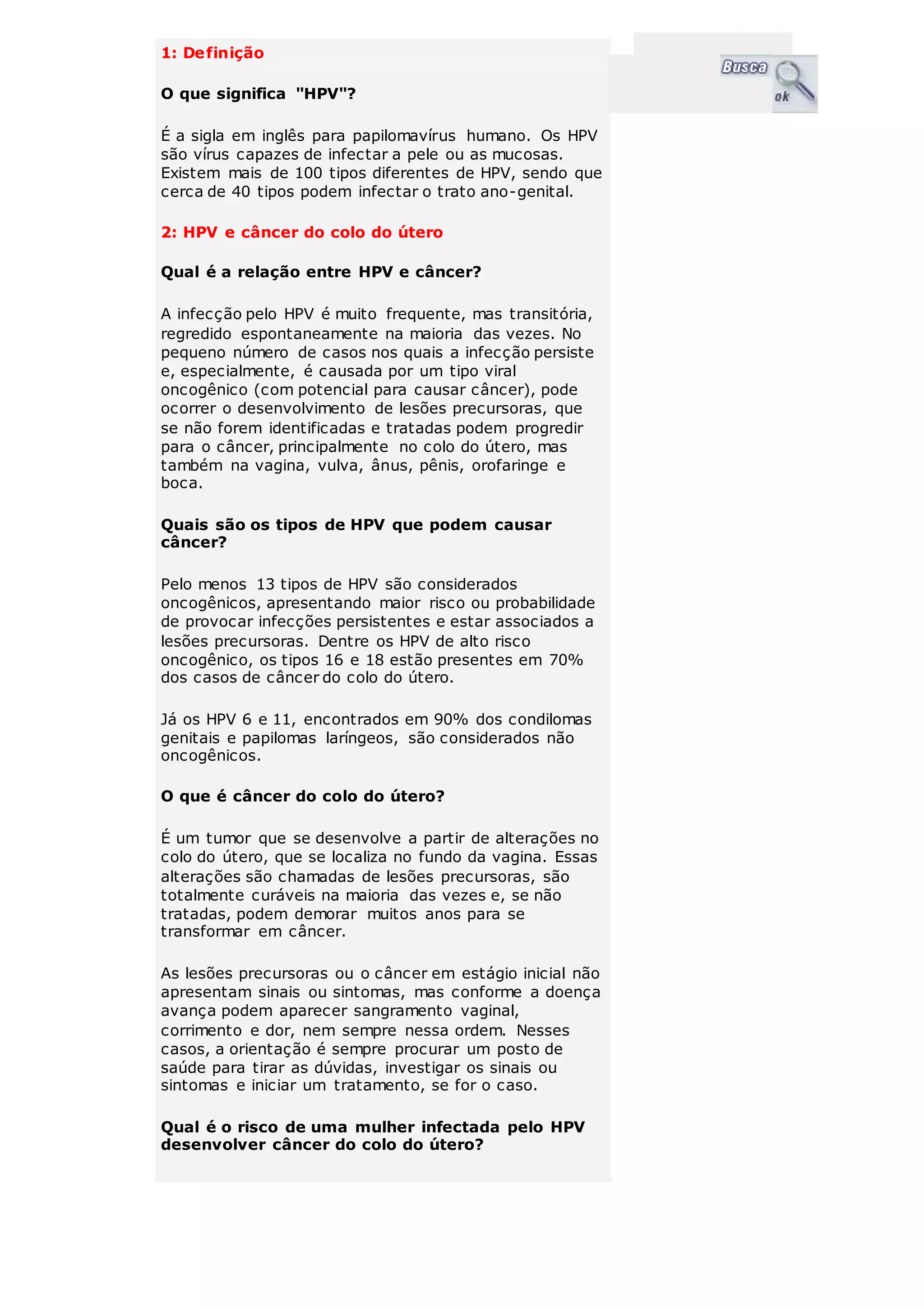 O documento discute o papilomavírus humano (HPV), relacionando-o principalmente ao câncer do colo do útero. Explica que certos tipos de HPV podem causar câncer e que a infecção pelo HPV é um fator necessário, mas não suficiente, para o desenvolvimento da doença. Também descreve formas de prevenção e tratamento, incluindo a realização de exames preventivos e a existência de vacinas contra HPV.