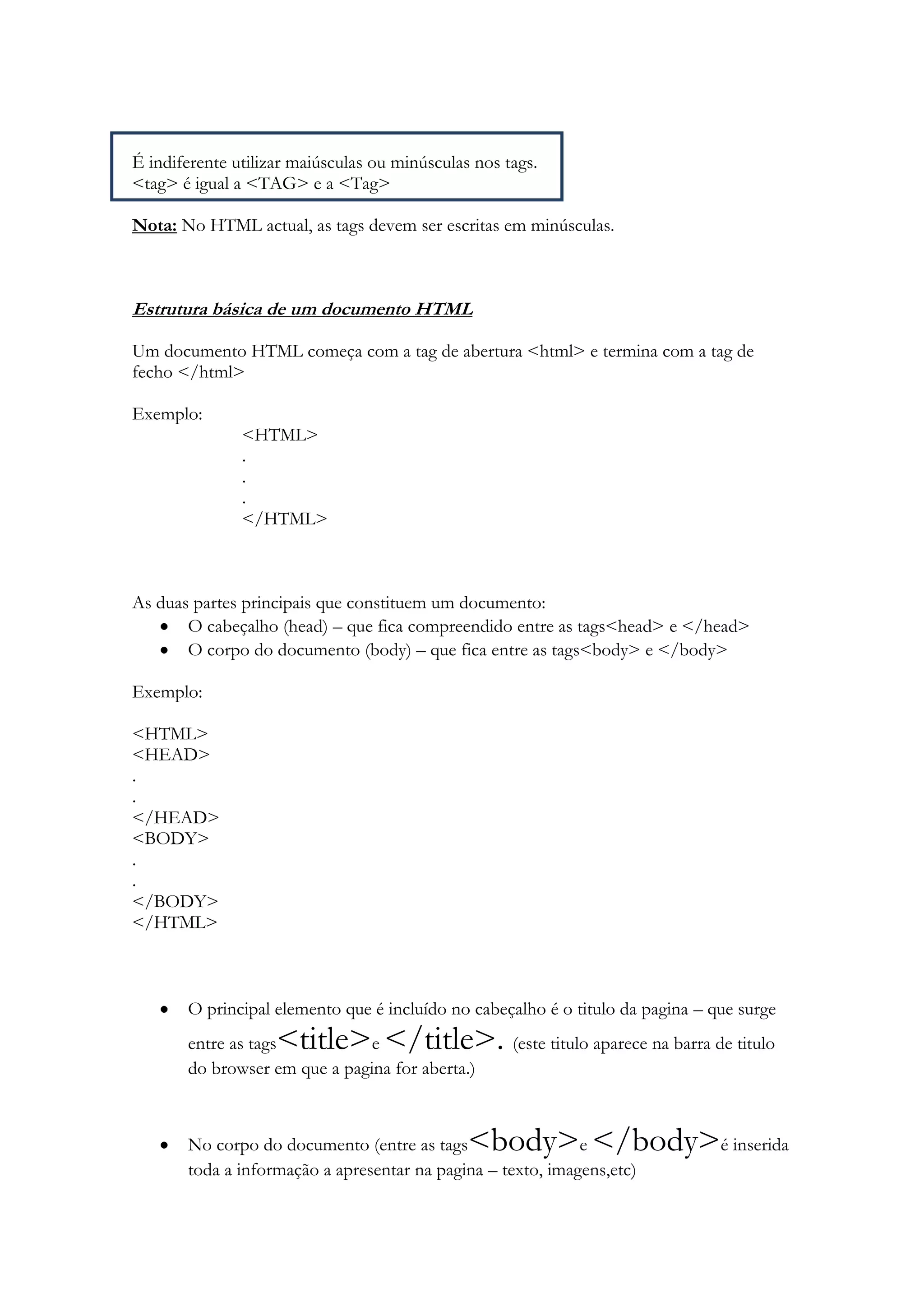 O documento descreve o que é HTML, a linguagem usada para criar páginas da web. HTML usa tags para estruturar o conteúdo em elementos como títulos, parágrafos e listas. O documento também explica como criar páginas HTML básicas usando um editor de texto.