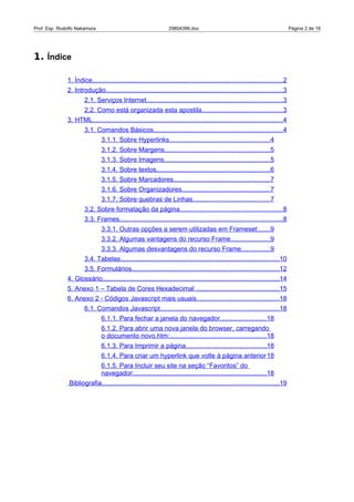Este documento apresenta os principais comandos da linguagem HTML para criação de páginas web. Explica tags básicas como <HTML>, <TITLE>, <BODY> e demonstra o uso de hyperlinks, imagens, formatação de texto e quebras de linha. Também aborda tabelas, formulários e frames.