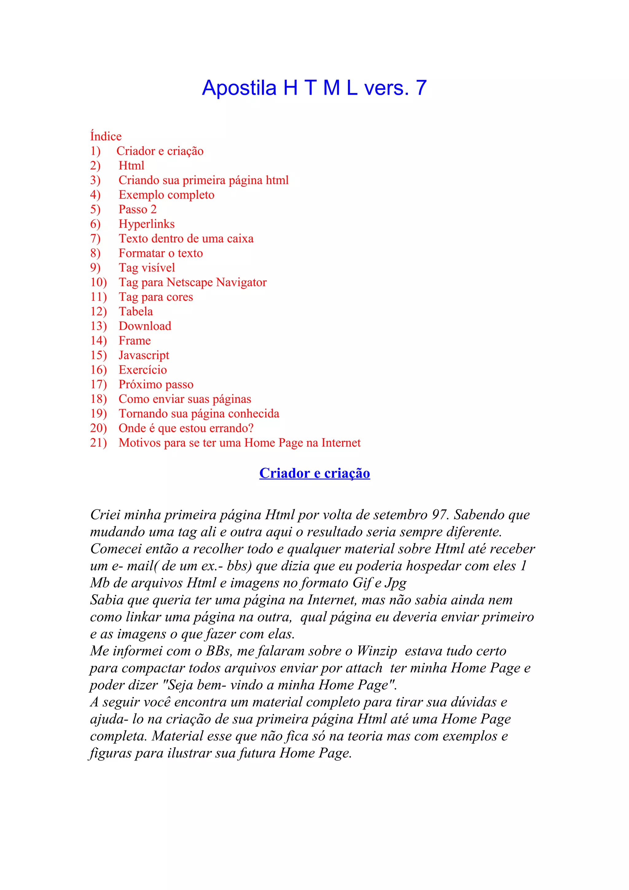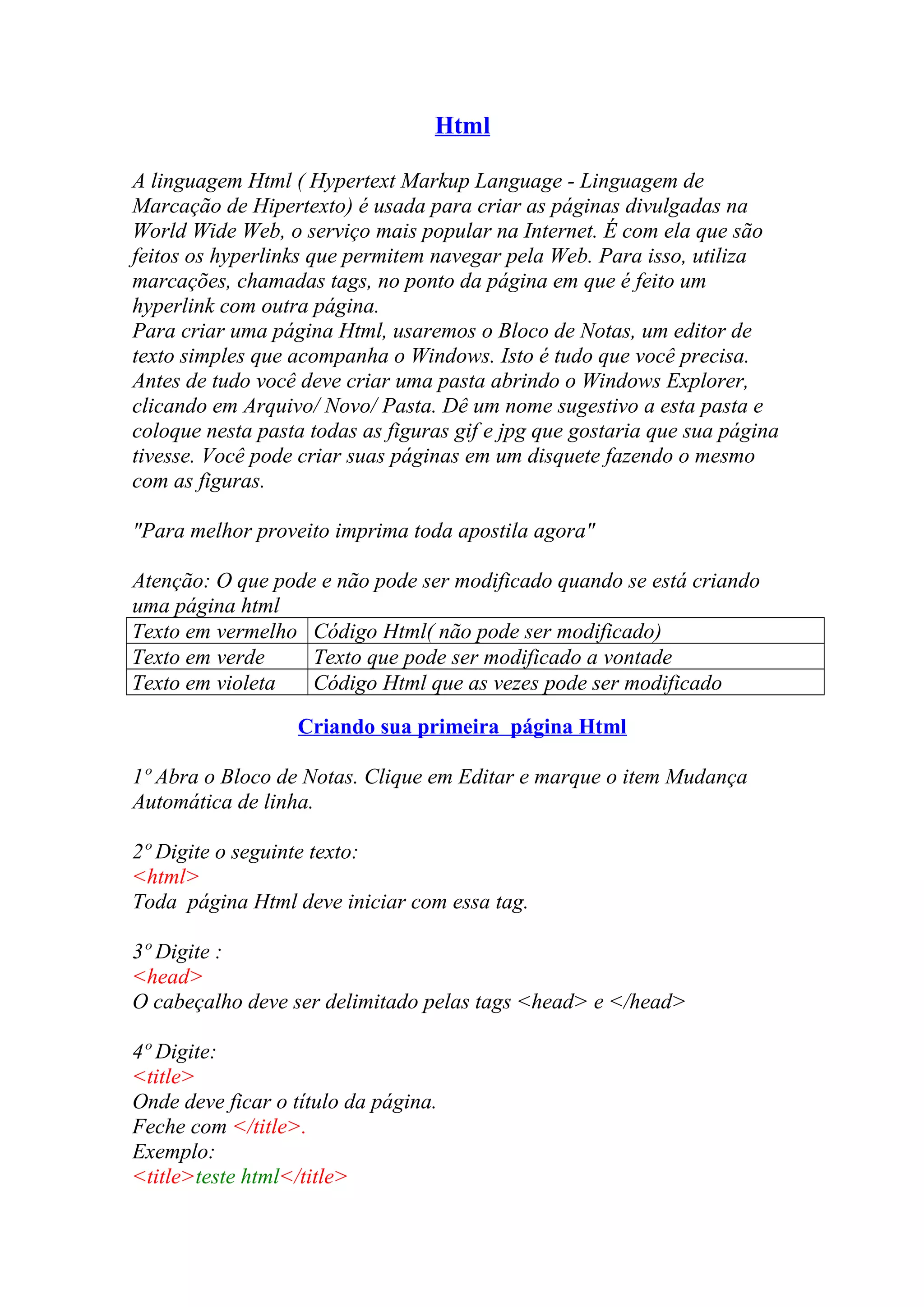 Este documento fornece instruções passo-a-passo para criar uma página HTML básica e uma home page completa, incluindo tags HTML, formatação de texto e inserção de imagens e hiperlinks. Ele também discute como tornar a página mais atraente com marcadores, cores de fundo e alinhamento de texto, e fornece exemplos de código para ilustrar os pontos cobertos.