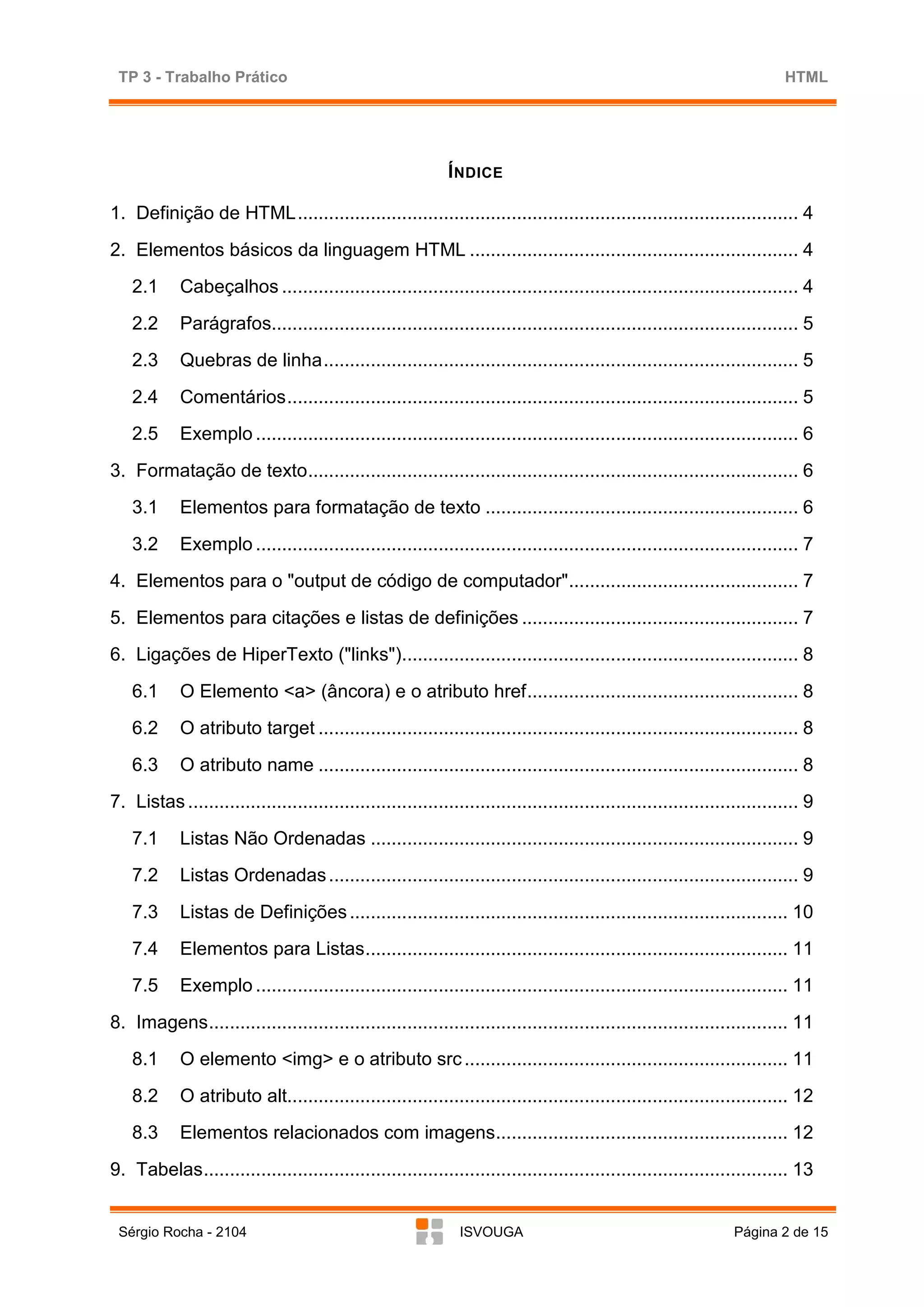 Este documento fornece uma introdução à linguagem HTML, descrevendo seus principais elementos estruturais e de formatação de texto como cabeçalhos, parágrafos, quebras de linha e elementos para formatação de texto. Além disso, explica elementos para links, listas, imagens e tabelas. O documento serve como um guia básico para aprender os conceitos fundamentais da linguagem HTML.