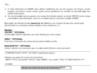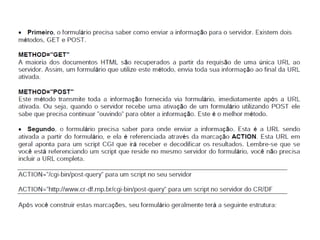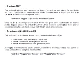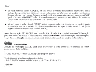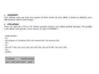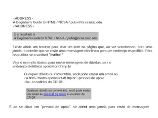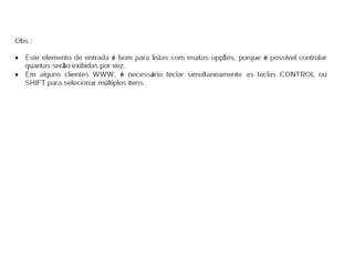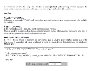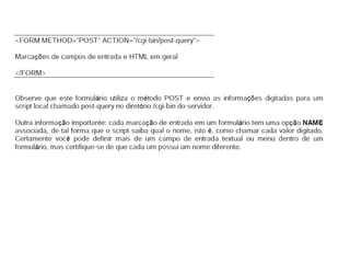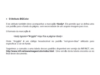 Este documento apresenta os conceitos básicos da linguagem HTML para iniciantes, incluindo a estrutura básica de uma página HTML, as principais tags como <div>, <span>, <h1-6>, <p>, <br>, âncoras, listas não ordenadas e ordenadas, inserção de imagens, formulários, entre outros. O documento também explica como estilizar páginas HTML com CSS e adicionar dinamismo com JavaScript.