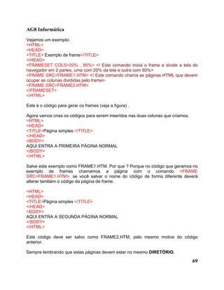 O documento explica como criar páginas web com frames, dividindo a tela do navegador em seções. Frames permitem incluir várias páginas HTML em uma única página, usando as tags <FRAMESET> e <FRAME>. A estrutura básica requer três arquivos: um arquivo principal contendo o código do frameset e dois arquivos para o conteúdo de cada frame.