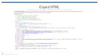 O documento resume o que é HTML, como funciona e suas principais tags. HTML é uma linguagem de marcação usada para criar páginas da web, utilizando tags para formatar o texto. As tags mais comuns são <head>, <title>, <body> e <br>.