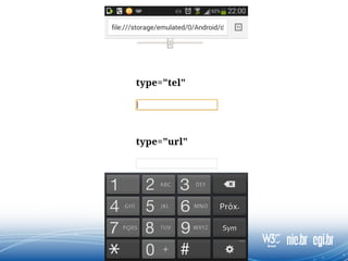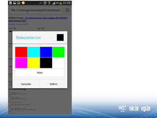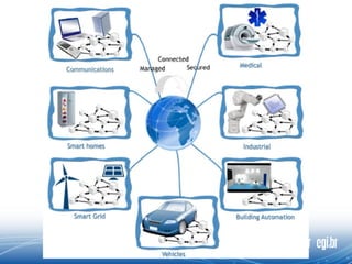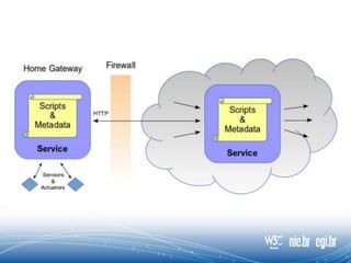 O documento discute o desenvolvimento para web móvel, fornecendo 10 dicas rápidas e abordando tecnologias como HTML5, CSS e APIs. Também apresenta exemplos de aplicações da Internet das Coisas e discute desafios como privacidade e segurança nesse contexto.