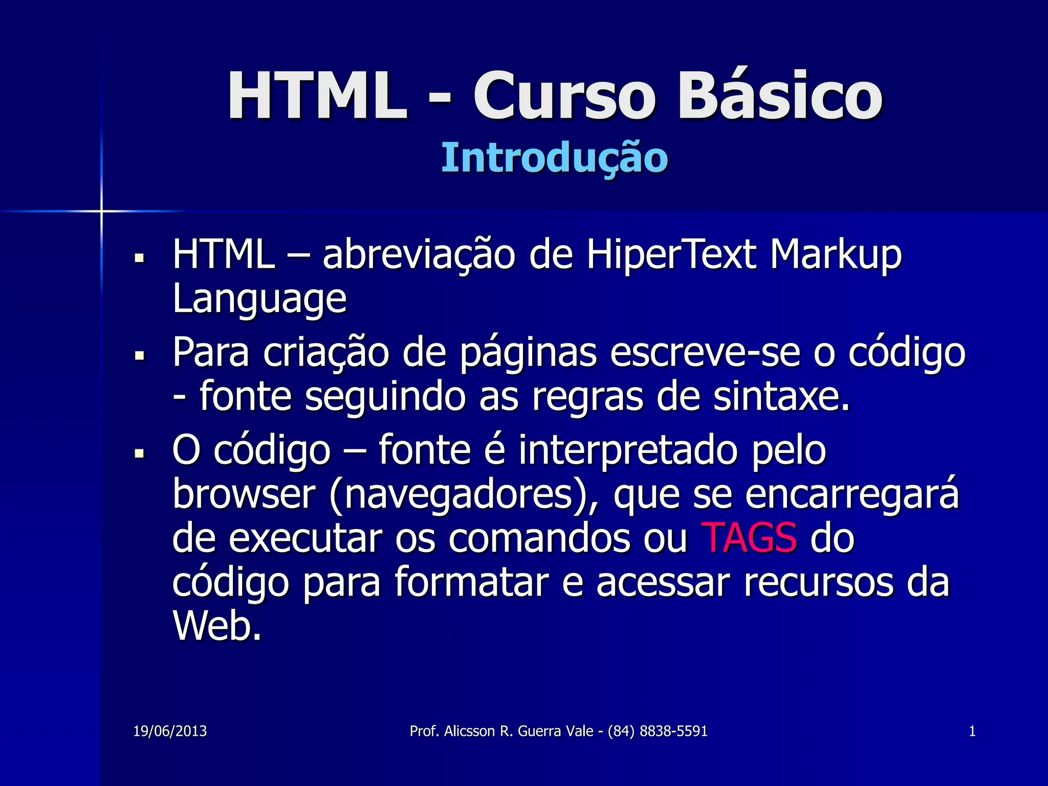 O documento apresenta uma introdução ao HTML, descrevendo sua finalidade de criação de páginas web, uso de tags e estrutura básica de uma página. São apresentados exemplos de tags comuns como <head>, <title>, <body> e tags para formatação como <h1>-<h6>, <p>, <br>, <center> e <hr>.