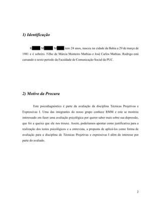 Este documento resume os resultados de uma avaliação psicológica realizada em Rodrigo Monteiro Mathias, de 24 anos. A avaliação incluiu entrevista, teste HTP e teste Palográfico. O HTP mostrou insegurança, timidez e atitudes defensivas. O Palográfico indicou rendimento médio no trabalho, com flutuações, e tendência para estresse e depressão. A entrevista revelou queixa de depressão e dificuldades em fazer amizades, mas bom relacionamento familiar e afetivo.