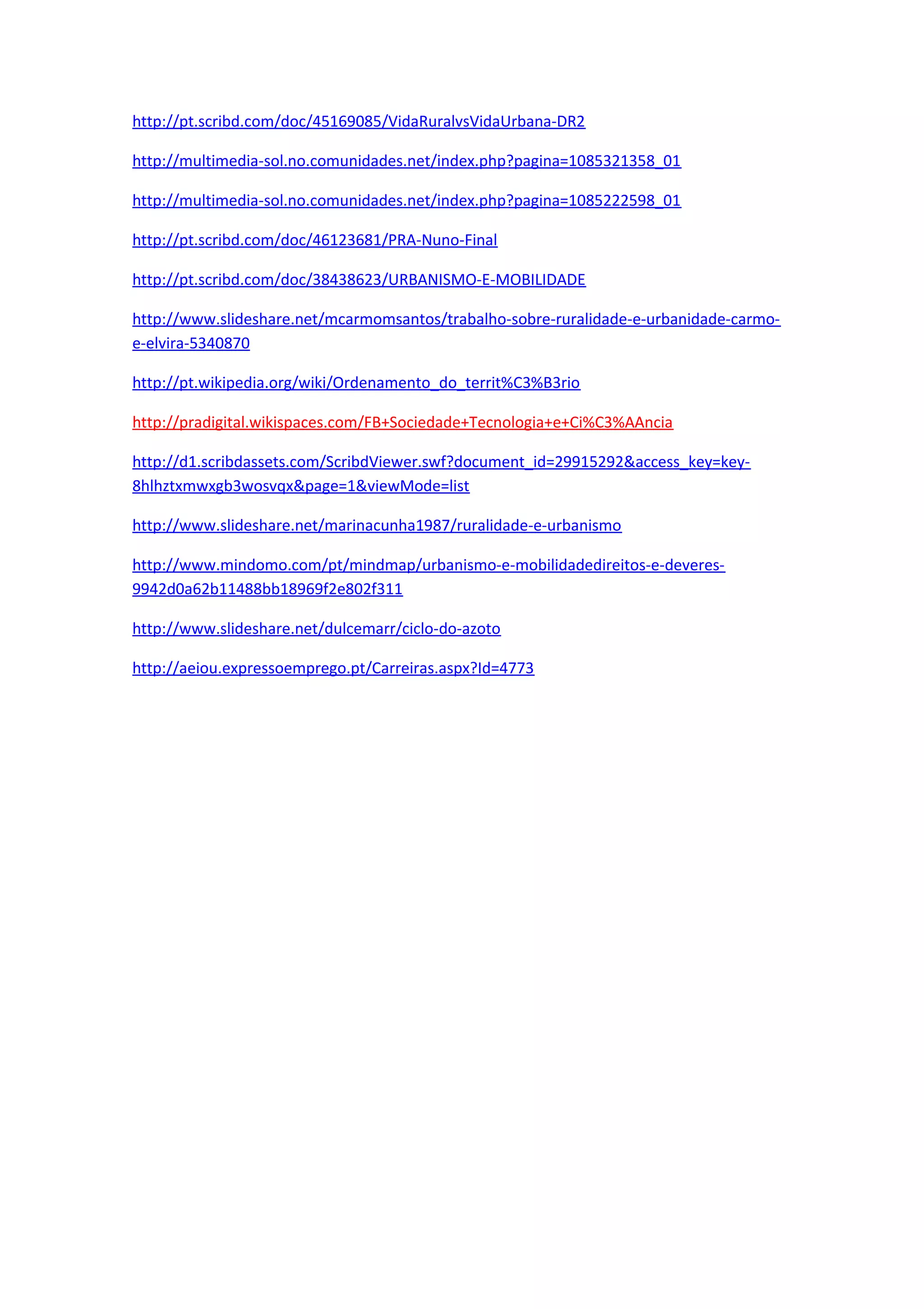 Os documentos fornecem informações sobre as diferenças entre vida rural e urbana, incluindo como o planejamento urbano e a mobilidade afetam cada uma. As fontes também discutem tópicos como ordenamento do território, tecnologia e sociedade, ruralidade versus urbanismo, e o ciclo do nitrogênio.