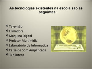 A escola possui várias tecnologias como televisão, filmadora, máquina digital e projetor multimídia. Estes recursos são usados para pesquisas de alunos e professores e contribuem para atividades em oficinas e projetos interdisciplinares, estimulando o interesse e compreensão dos alunos. O projetor e outros recursos são também usados em aulas e eventos na escola.