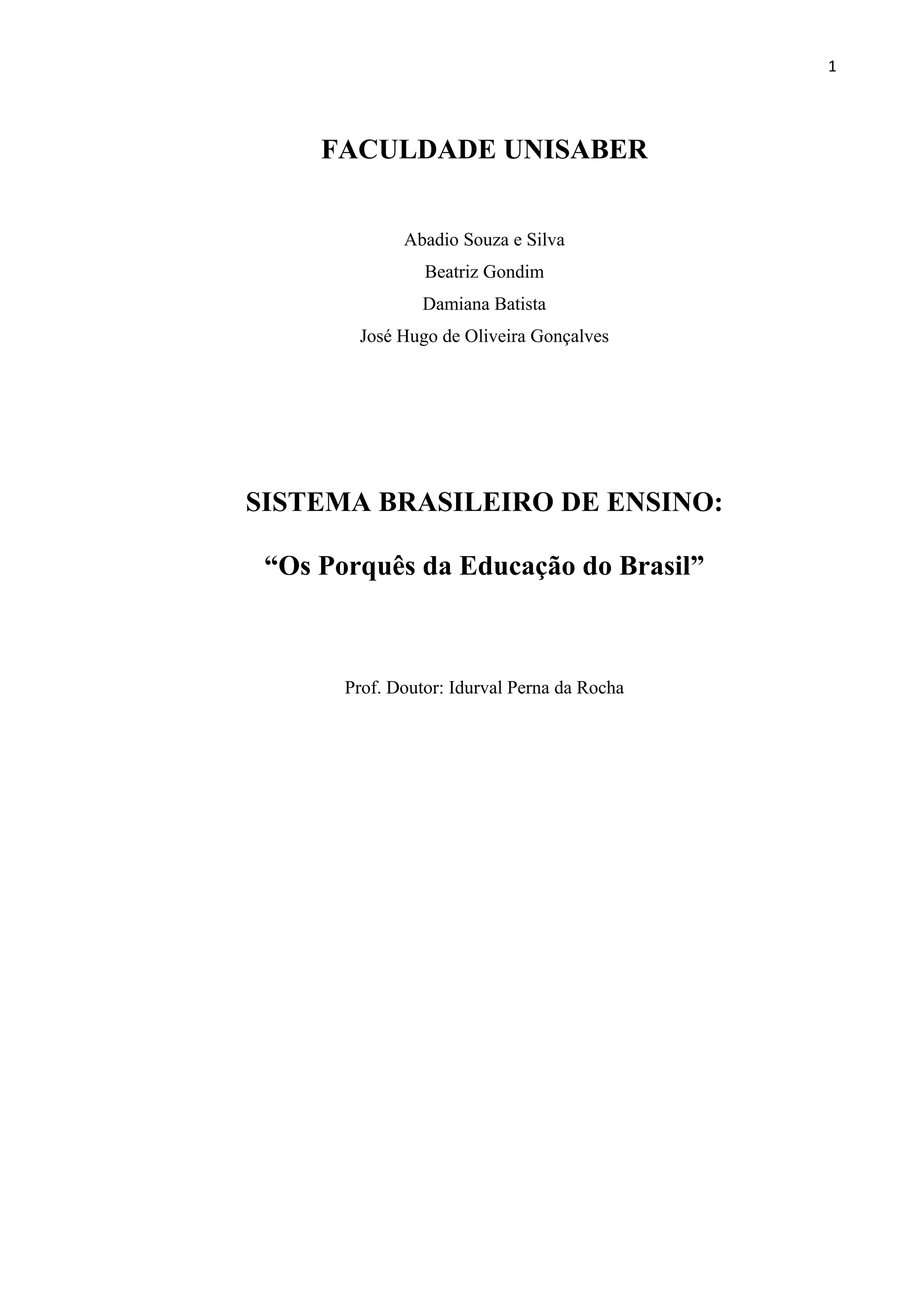 [1] O documento discute os problemas do sistema educacional brasileiro, incluindo a falta de oferta de vagas em escolas regulares, a ausência de políticas públicas eficientes e a falta de qualificação profissional.