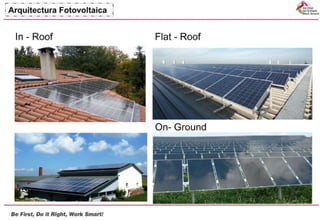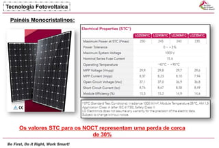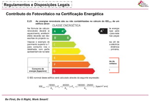 O documento aborda a eficiência energética e a tecnologia fotovoltaica, destacando a relação entre energia fornecida e produzida em sistemas solares. Também menciona regulamentos legais para instalação de sistemas fotovoltaicos, abordando micro e minigeração, além de barreiras e preocupações em reabilitação urbana. Por fim, discute a arquitetura e design de painéis solares, incluindo soluções de integração estética e eficiência computacional.
