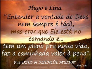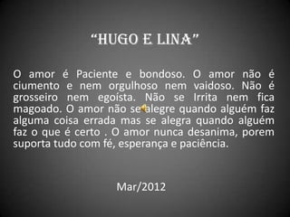 O documento fala sobre o amor entre Hugo e Lina, descrevendo o amor como paciente, bondoso e não egoísta. Expressa o desejo de passar a vida inteira com a pessoa amada, acordando e dormindo ao seu lado, e cita a frase bíblica "o que Deus une, homem nenhum separa".