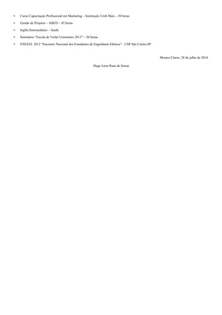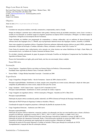 Hugo Leon Ruas de Sousa é um engenheiro eletricista de 23 anos que busca uma posição na área de engenharia elétrica no setor público ou privado. Ele tem experiência como estagiário, cinegrafista, atendente e engenheiro eletricista autônomo. Hugo tem formação superior em Engenharia Elétrica e domínio de programação, sistemas embarcados e softwares como AutoCAD, Lumine e Matlab.