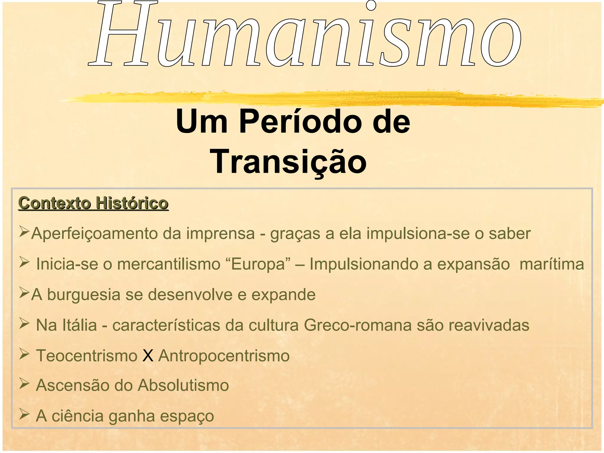 O documento descreve o período de transição entre o feudalismo e o mercantilismo na Europa, marcado pela decadência do sistema feudal, surgimento das cidades e da burguesia. Apresenta também as origens do pensamento humanista na Itália e seu caráter mais antropocêntrico em oposição à visão teocêntrica medieval. Por fim, aborda as principais características da literatura, arte e teatro durante o período do Renascimento em Portugal.