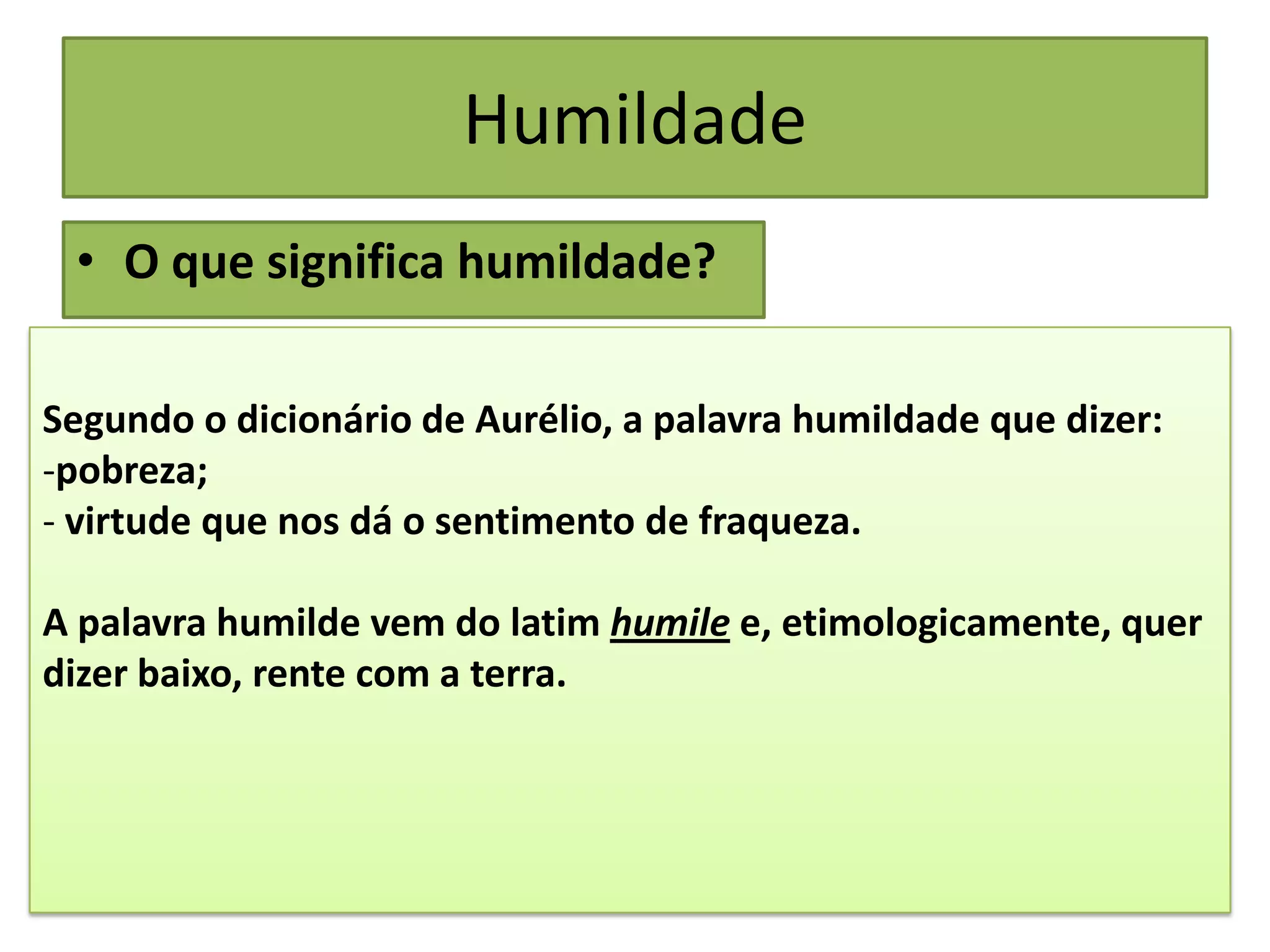 O documento discute o tema da humildade, definindo-a como uma virtude esquecida que nos ajuda a nos ver como iguais e a nos ajudarmos mutuamente. Apresenta exemplos de humildade de Jesus, como nascer em um estábulo e lavar os pés dos discípulos. Conclui enfatizando a importância da humildade no trabalho espírita para evitar o orgulho e o egoísmo.