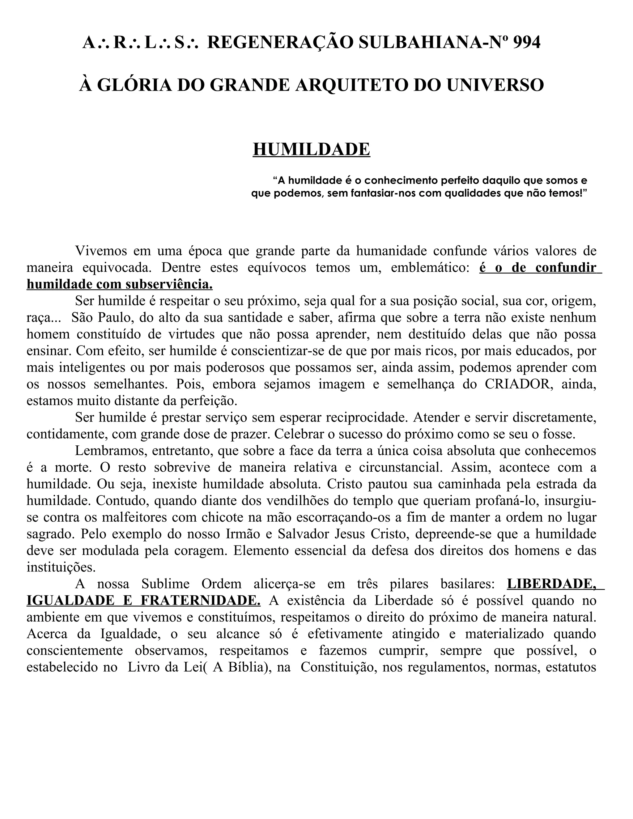 Este documento discute a humildade e como ela não deve ser confundida com subserviência. A humildade é respeitar os outros e reconhecer que sempre há espaço para aprender, mesmo para os mais poderosos. A humildade também significa servir aos outros sem esperar nada em troca. No entanto, a humildade absoluta não existe, e coragem é necessária para defender os direitos humanos.