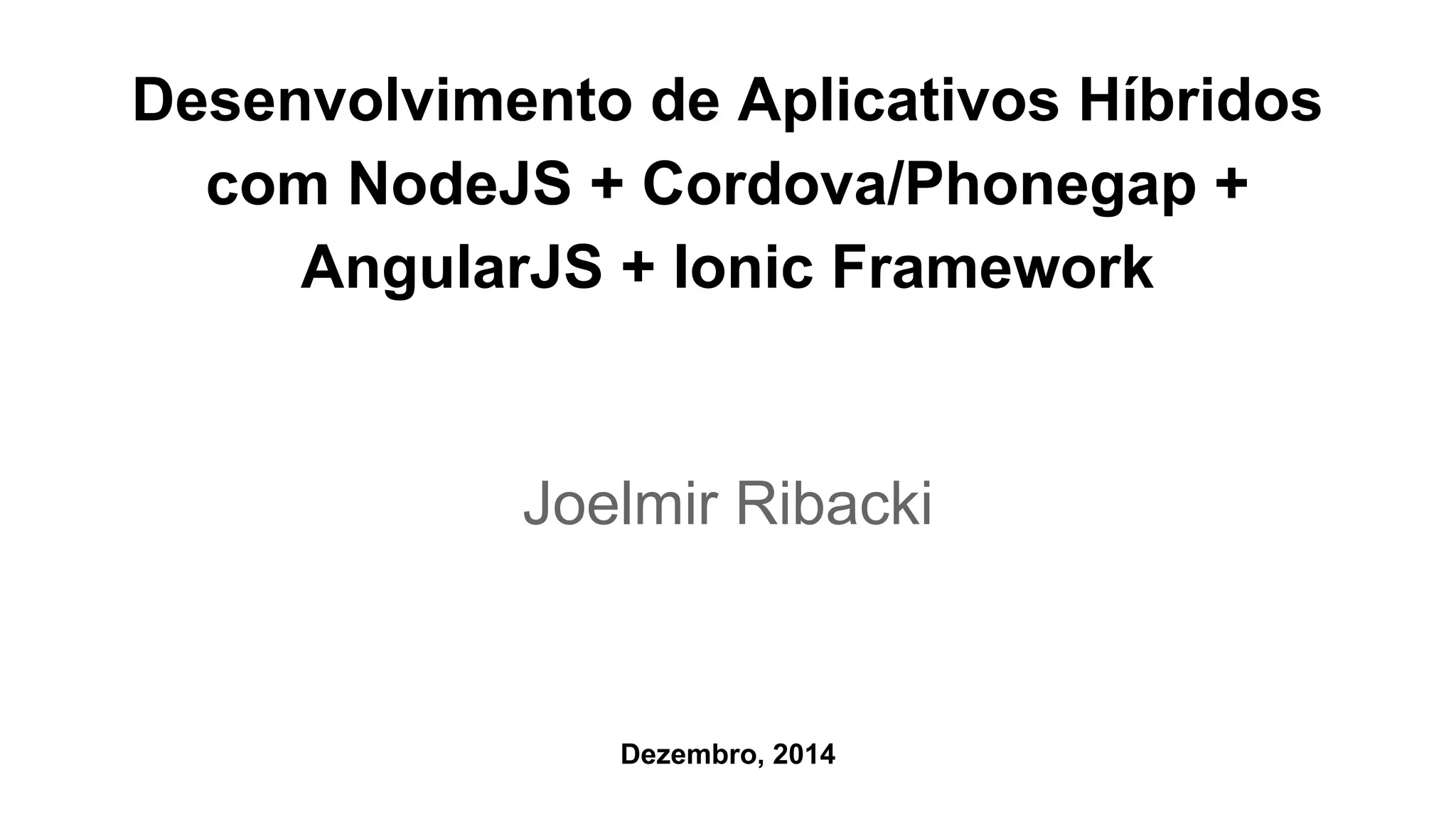 Este documento discute o desenvolvimento de aplicativos híbridos usando NodeJS, Cordova/Phonegap, AngularJS e o framework Ionic. É explicado como essas tecnologias podem ser usadas juntas para criar aplicativos multiplataforma com um único código base. Além disso, são detalhados os passos iniciais para criar um aplicativo simples e a estrutura geral de um projeto nesta abordagem.