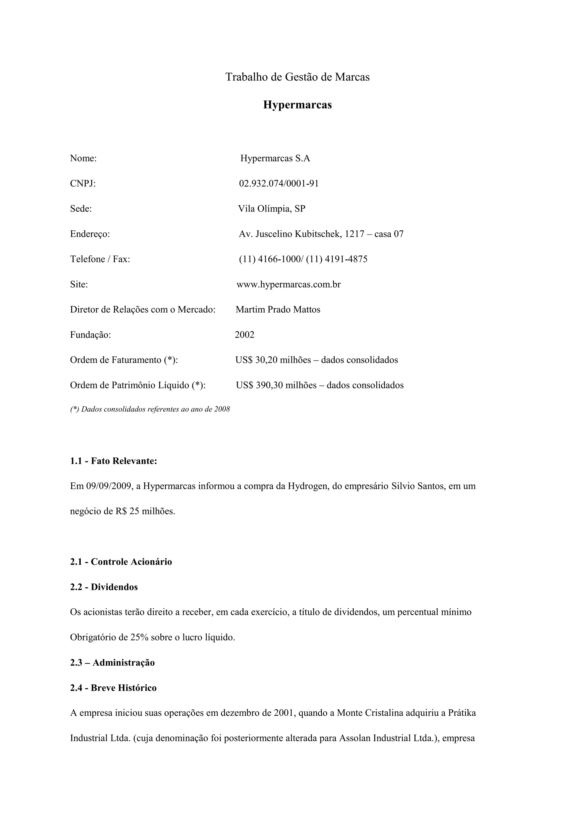 [1] O documento apresenta informações sobre a Hypermarcas S.A., incluindo seu nome, CNPJ, sede, contato, fundação e dados financeiros consolidados de 2008. [2] A Hypermarcas atua nos setores de higiene e limpeza, alimentos, beleza e medicamentos, com marcas como Assolan, Mat Inset e Etti. [3] Ao longo de sua história, a Hypermarcas expandiu suas operações por meio de aquisições de outras empresas e marcas.