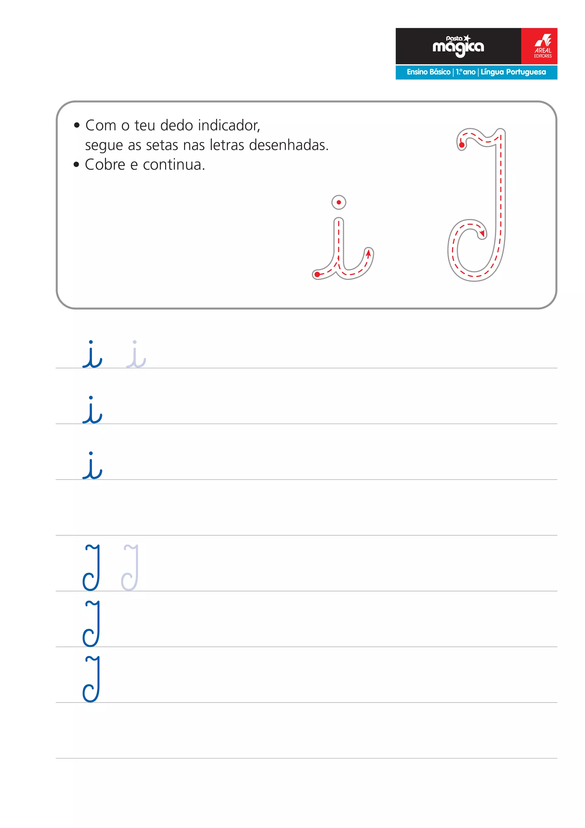 As três frases fornecem uma atividade de alfabetização para crianças no 1o ano que envolve seguir setas desenhadas em letras e cobrir parte da letra para continuar a atividade. A atividade parece focar no reconhecimento e sequenciamento de letras do alfabeto.