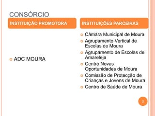 Este documento descreve o projeto "Encontros" que promove a inclusão social de crianças ciganas em Moura através da educação e do empoderamento digital. Parte do projeto é o Centro de Inclusão Digital que oferece acesso gratuito à internet, cursos de TI, apoio escolar e formação profissional para aumentar as qualificações da comunidade.