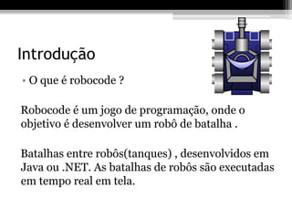 O documento apresenta uma introdução ao jogo Robocode, onde robôs desenvolvidos em Java ou .NET batalham em tempo real. Aprende-se que o objetivo é construir o melhor robô destruindo os demais, e que o jogo ensina conceitos de programação de forma divertida. É explicado também como baixar e instalar o Robocode, os requisitos do sistema e a anatomia básica de um robô participante.