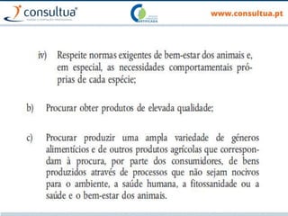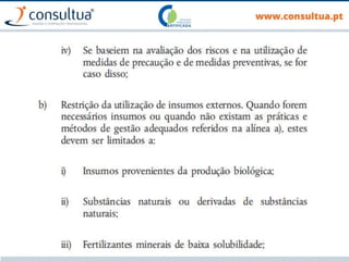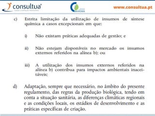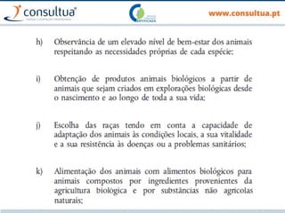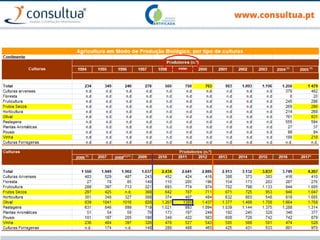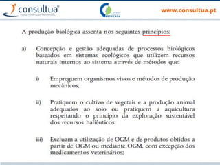 Este documento discute a agricultura biológica, resumindo sua história, princípios, regulamentação e situação atual em Portugal. A agricultura biológica surgiu de vários movimentos no século XX que buscavam formas mais sustentáveis de produção. Atualmente, a área dedicada à agricultura biológica em Portugal vem crescendo significativamente nos últimos anos e espera-se que atinja 250.000 hectares até 2020.