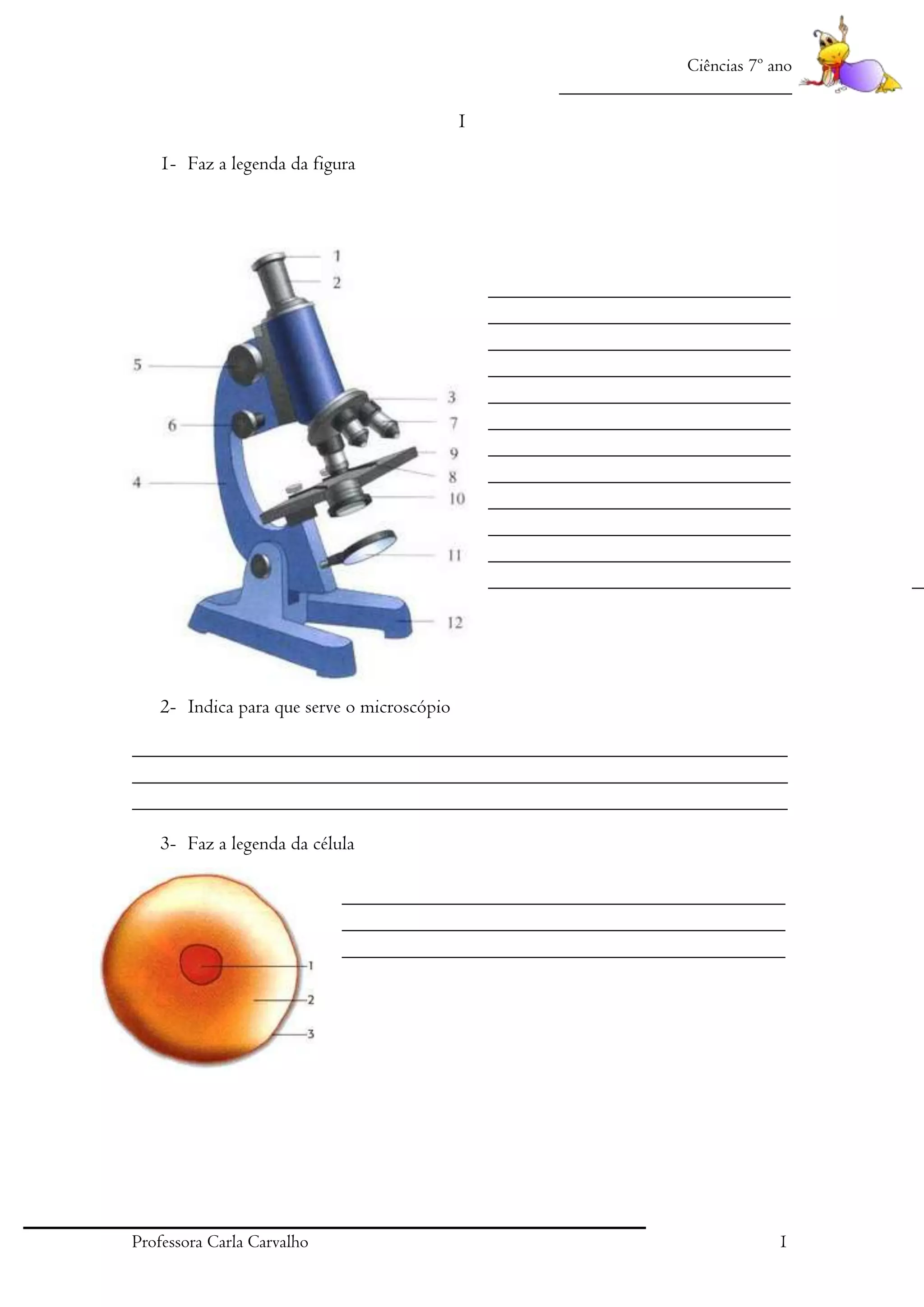 Este documento apresenta perguntas sobre células, seres unicelulares e pluricelulares, e classificação de animais. Os alunos são instruídos a fazer legendas de figuras, definir partes da célula, distinguir tipos de células e seres vivos, e preencher uma tabela com características de animais.