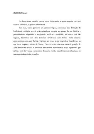 Este documento discute as teorias de Alan Turing e John Searle sobre inteligência artificial. Apresenta o teste de Turing como uma proposta de Turing para determinar se máquinas podem pensar, mas Searle critica este teste e argumenta que máquinas podem simular pensamento sem realmente possuí-lo por meio de seu argumento do "quarto chinês".