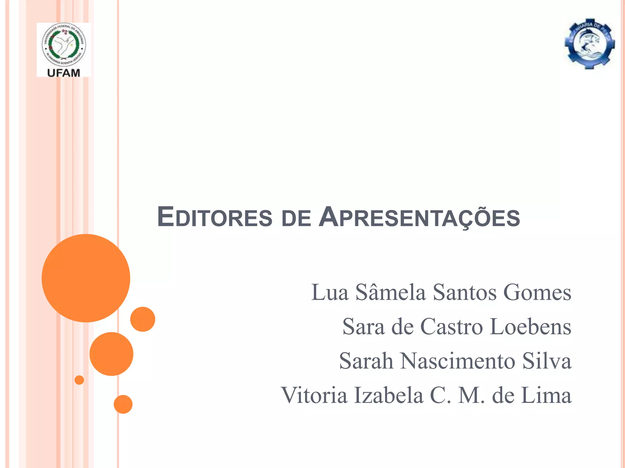 O documento discute editores de apresentações, mencionando o Microsoft PowerPoint, Keynote, BrOffice Impress, Corel Presentations, IBM Lotus Freelance Graphics e Google Docs. Também aborda tipos de editores como software livre, freeware e aplicações web, além de dicas sobre apresentações.