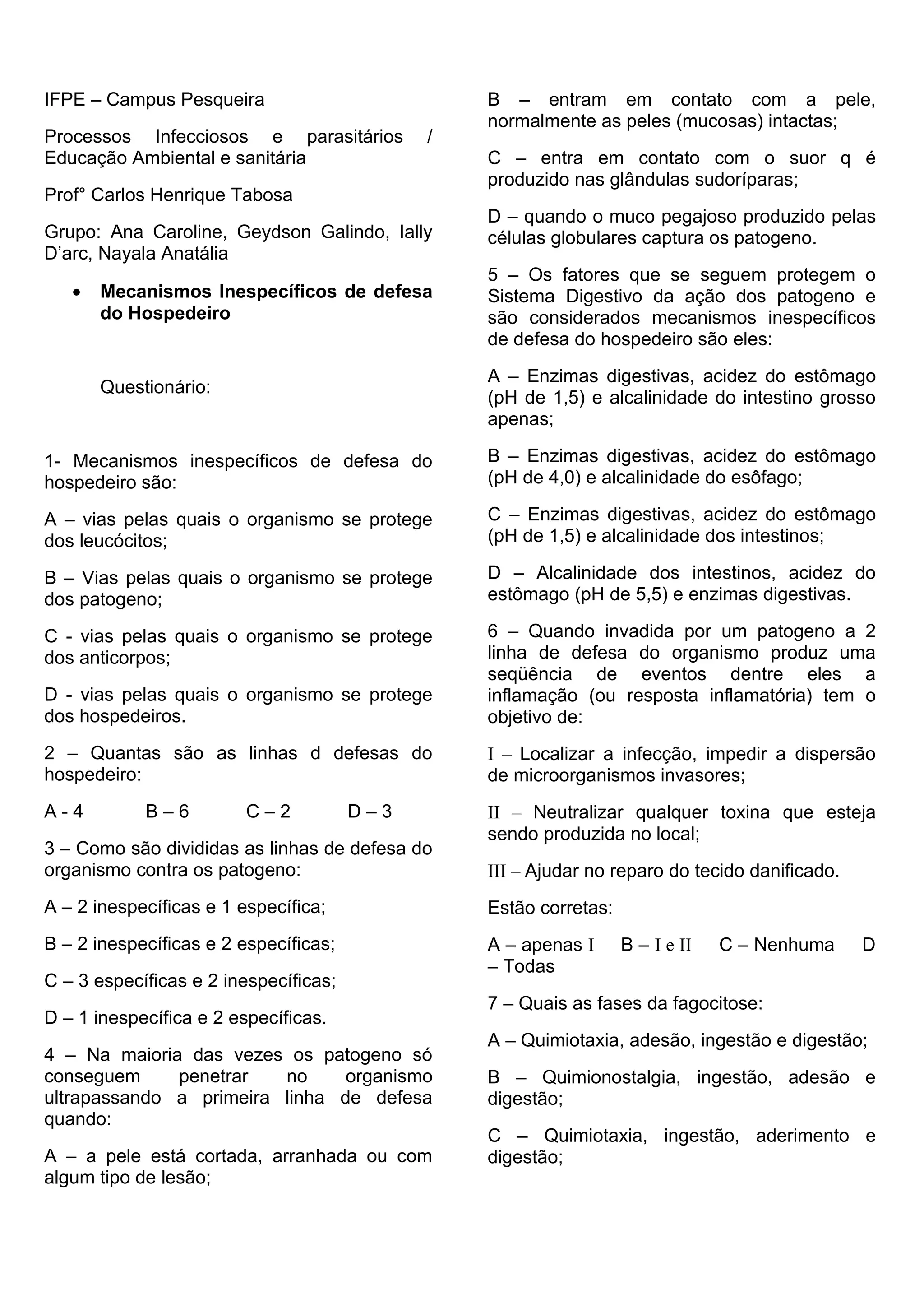 O documento discute os mecanismos inespecíficos de defesa do organismo contra patógenos, incluindo a pele, suor, muco e sistema digestivo. Ele também descreve as linhas de defesa do organismo, as etapas da fagocitose e fatores que podem impedir a defesa inespecífica.