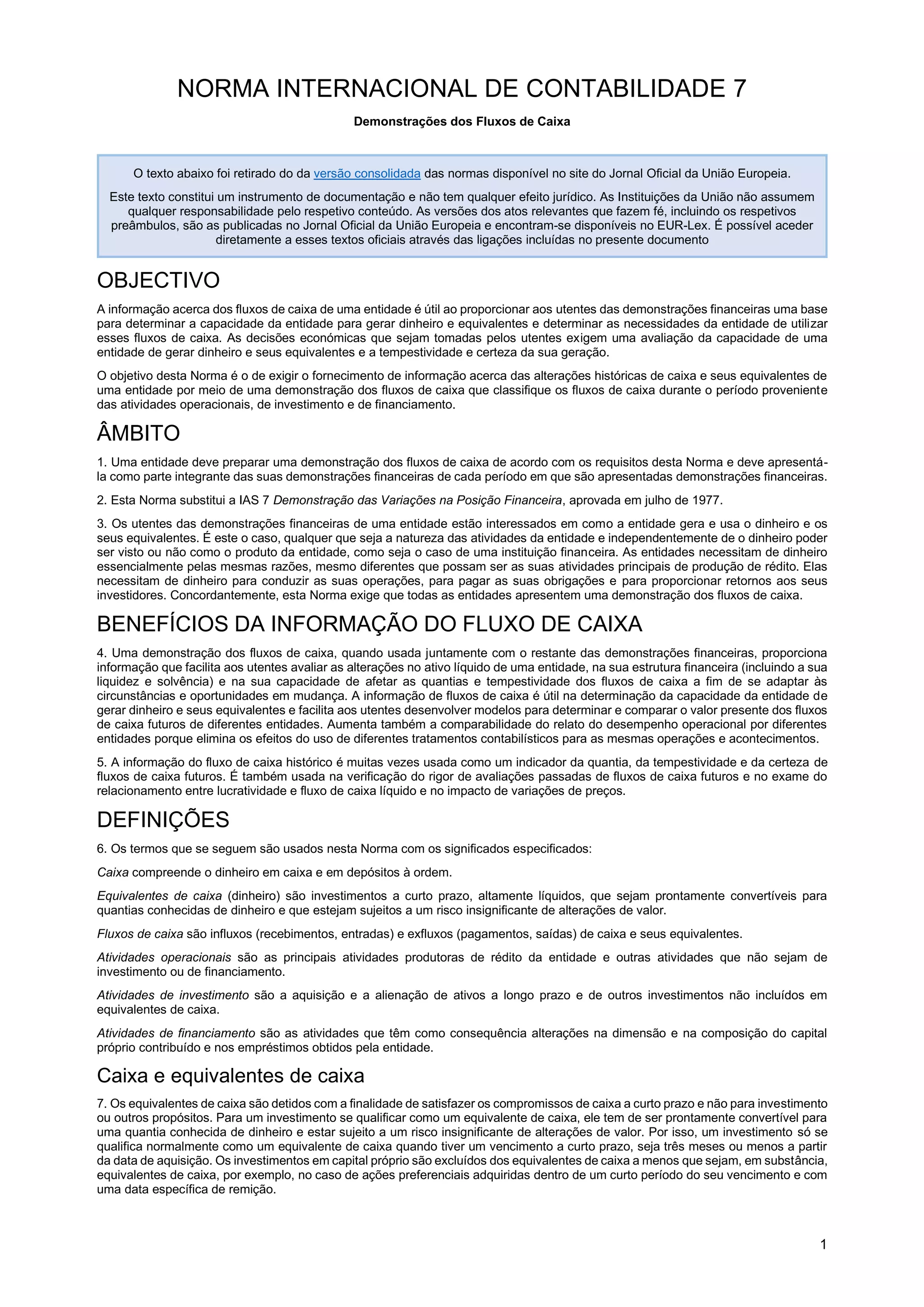 1. Este documento descreve a Norma Internacional de Contabilidade 7 sobre demonstrações dos fluxos de caixa. 2. O objetivo é exigir que as entidades forneçam informações sobre as alterações históricas de caixa e equivalentes de caixa através de uma demonstração dos fluxos de caixa classificados por atividades operacionais, de investimento e de financiamento. 3. A norma define termos como caixa, equivalentes de caixa e fluxos de caixa e estabelece requisitos para a apresentação e divulgação da demonstração dos fluxos