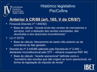 O documento discute o tratamento tributário das "receitas de terceiros" no PIS/Cofins. Apresenta o histórico legislativo dos dois tributos e como a base de cálculo foi evoluindo de "faturamento" para "receita bruta", com espectros mais amplos de incidência. Também aborda a jurisprudência do STF, STJ e Conselho de Contribuintes sobre a não incidência do tributo em receitas de interconexão de redes e roaming quando o ingresso é temporário e de terceiros.