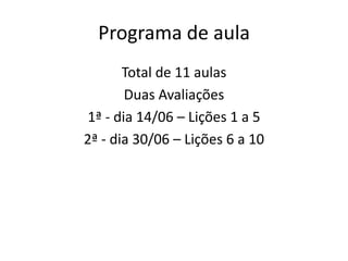 O documento apresenta um programa de aulas sobre os Evangelhos dividido em 11 lições, com duas avaliações. Apresenta também um índice dos capítulos que abordam a introdução aos Evangelhos, a cultura presente nos Evangelhos, a relação com o Antigo Testamento e análises individuais dos Evangelhos de Mateus, Marcos, Lucas e João.