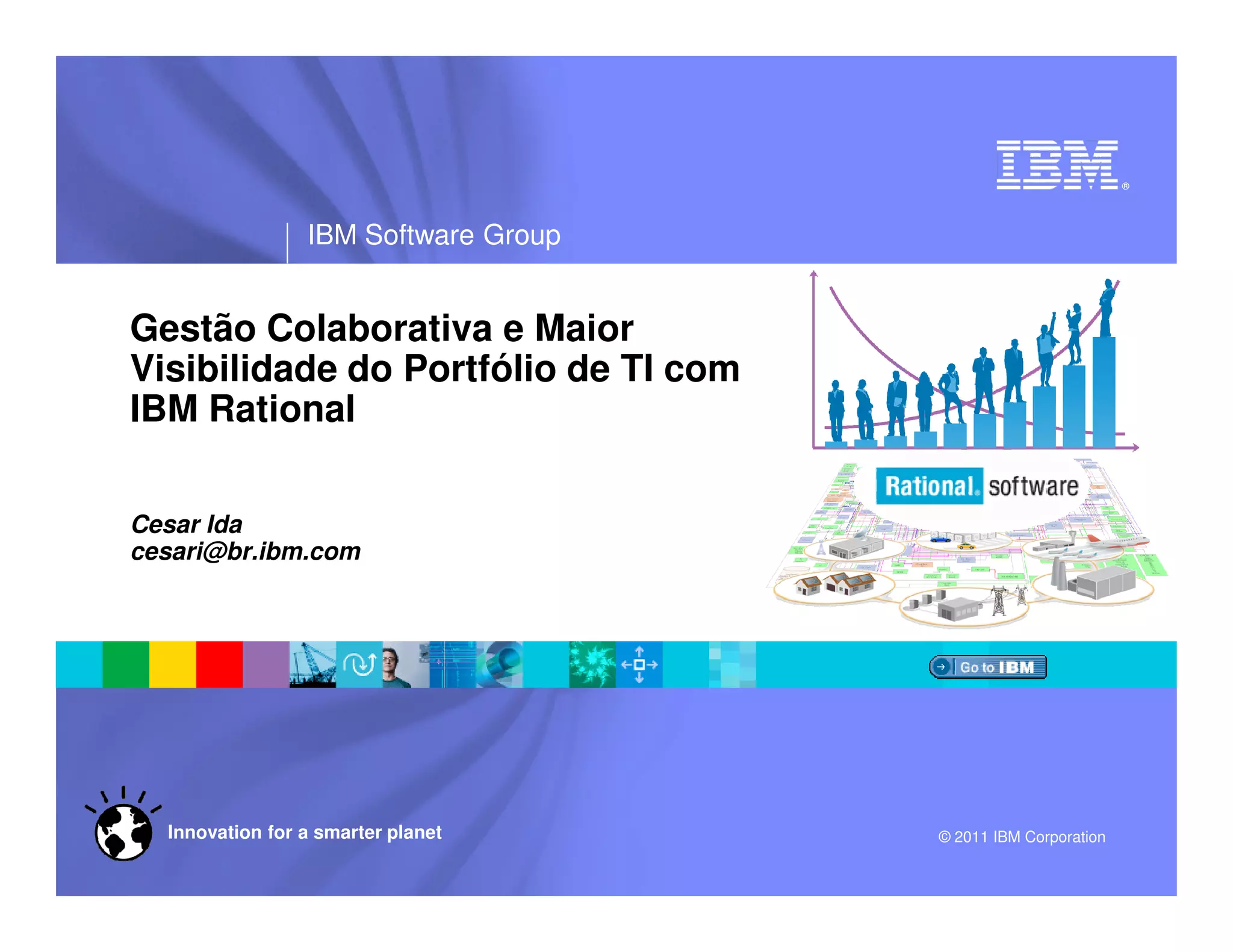 A apresentação descreve soluções da IBM para gestão de portfólios e projetos de TI, incluindo o Rational Focal Point para alinhamento de investimentos, o Rational Team Concert para planejamento e execução colaborativa de projetos, e o Rational Insight para medição de desempenho. A solução da IBM oferece funcionalidades integradas para melhorar a visibilidade e colaboração em toda a gestão de portfólios e projetos de TI.