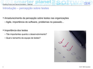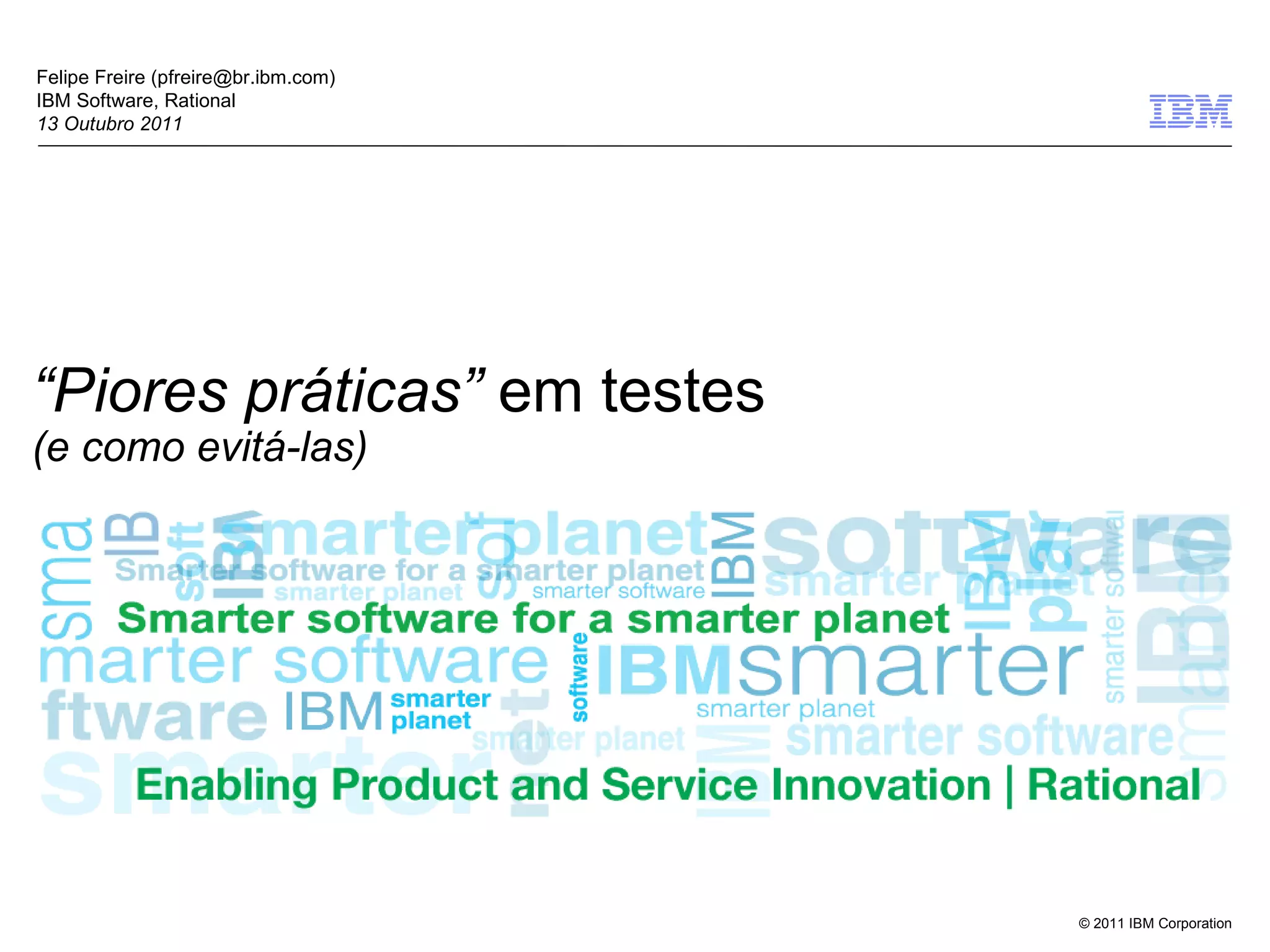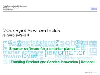 O documento discute piores práticas em testes de software e como evitá-las, listando 8 problemas comuns como deixar os testes para o final, acreditar que dois ciclos de testes são suficientes, e permitir que qualquer pessoa crie e execute testes. Ele oferece soluções como planejar testes no início do projeto, liberar builds com frequência para testes, e contratar testadores experientes.