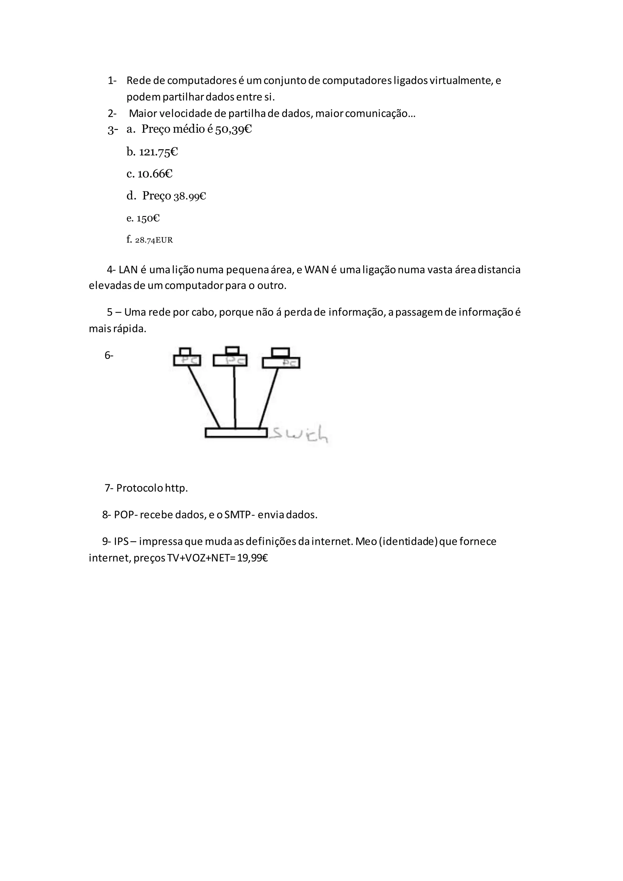 Um documento sobre redes de computadores, definindo-as como um conjunto de computadores ligados virtualmente que podem partilhar dados. Descreve as vantagens de maior velocidade de partilha de dados e comunicação em LANs em pequenas áreas, versus WANs que ligam computadores a grandes distâncias. Detalha também protocolos como HTTP, POP e SMTP.