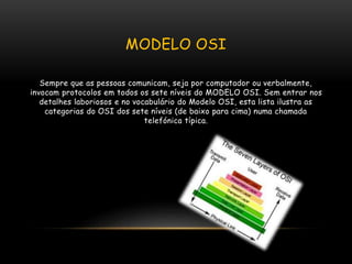 O documento descreve os sete níveis do Modelo OSI e como cada nível é representado em uma chamada telefônica típica, começando pela camada física que define os meios de transmissão até a camada de aplicação que estabelece a interface entre o software do usuário e as camadas inferiores.