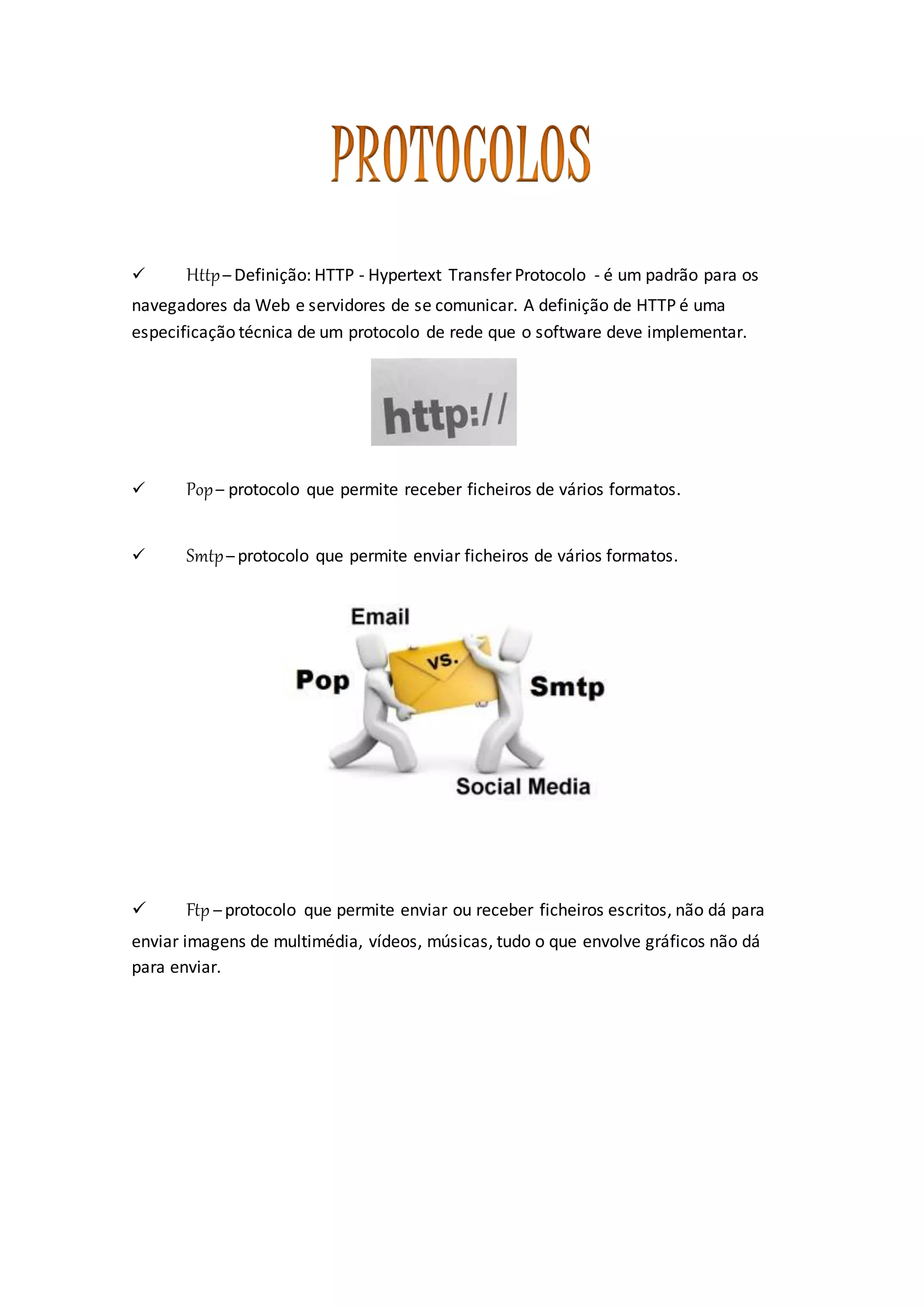 HTTP é o protocolo padrão para comunicação entre navegadores e servidores na Web. POP e SMTP permitem receber e enviar ficheiros de vários formatos respectivamente, enquanto FTP permite transferir ficheiros de texto mas não consegue enviar ficheiros multimédia como imagens ou vídeos.