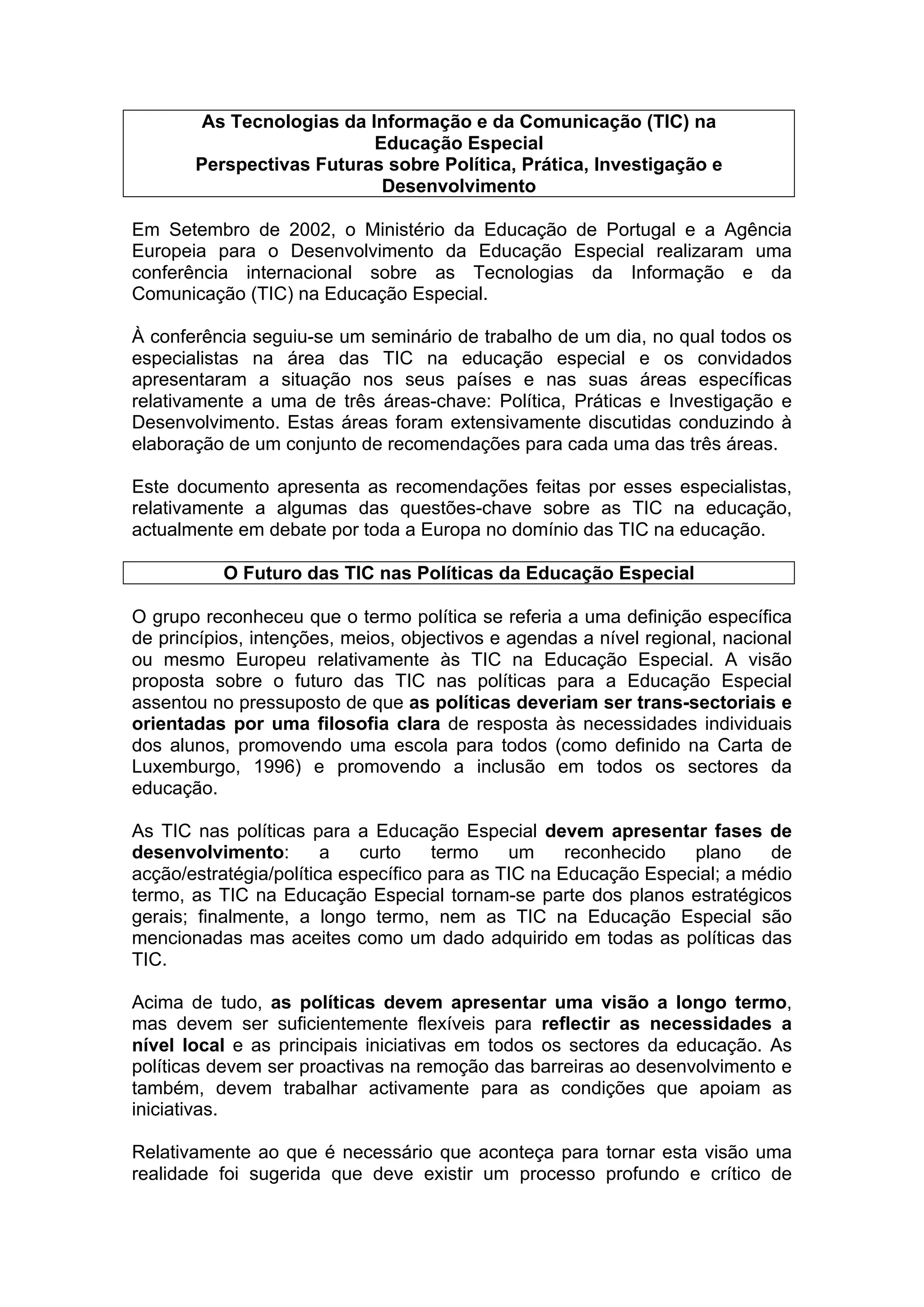 Este documento resume as recomendações de especialistas em Tecnologias da Informação e Comunicação (TIC) na Educação Especial sobre políticas, práticas, pesquisa e desenvolvimento. As recomendações incluem o desenvolvimento de políticas transversais e flexíveis, a criação de redes de colaboração, e o foco da pesquisa na aprendizagem inclusiva apoiada por tecnologia acessível.