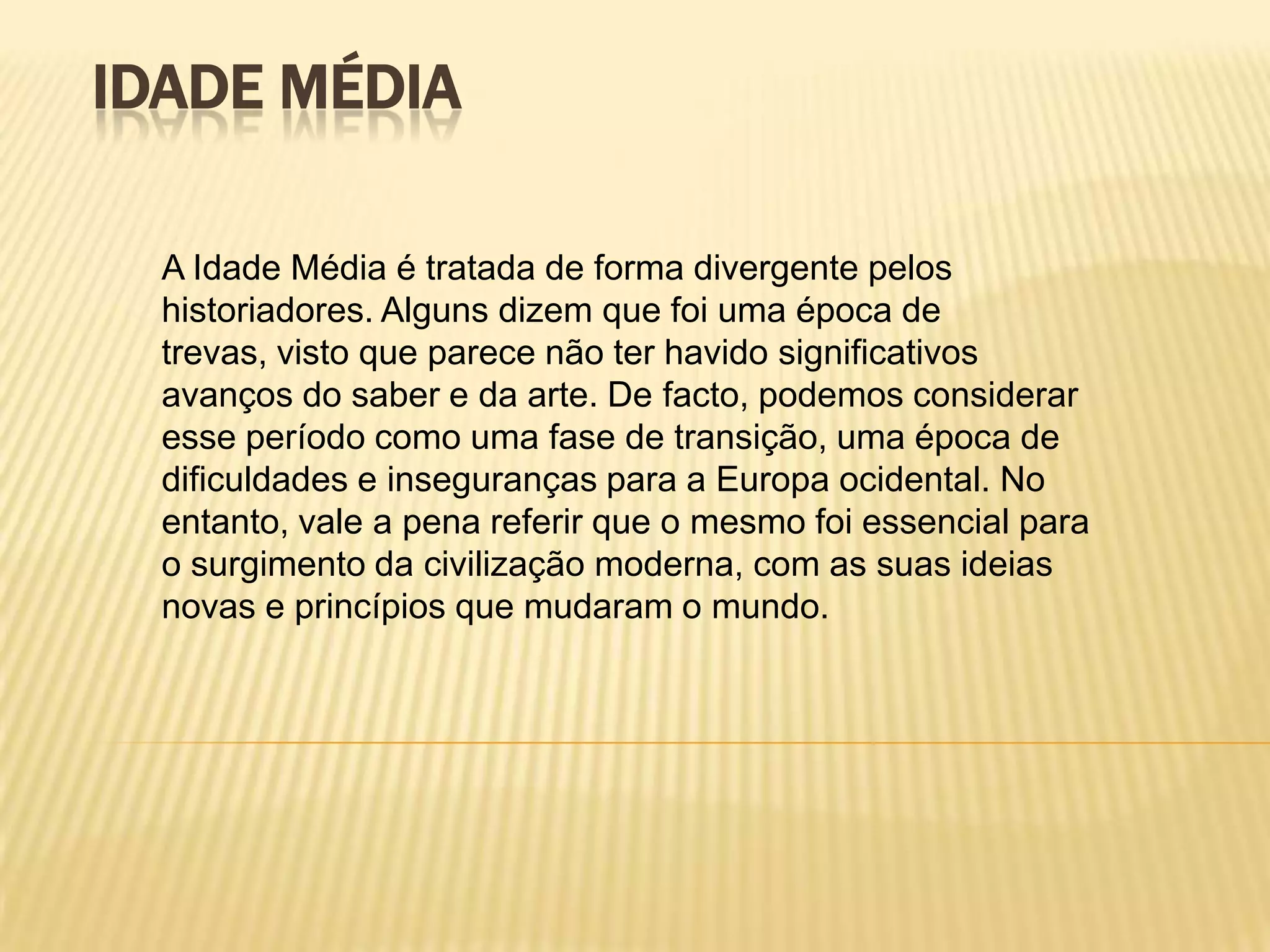 A Idade Média é dividida em duas fases: Alta Idade Média caracterizada pelo sistema feudal e Baixa Idade Média que viu o renascimento cultural e econômico da Europa. O feudalismo emergiu como forma de organização entre os séculos V-X, com senhores feudais controlando a terra em troca de apoio militar.