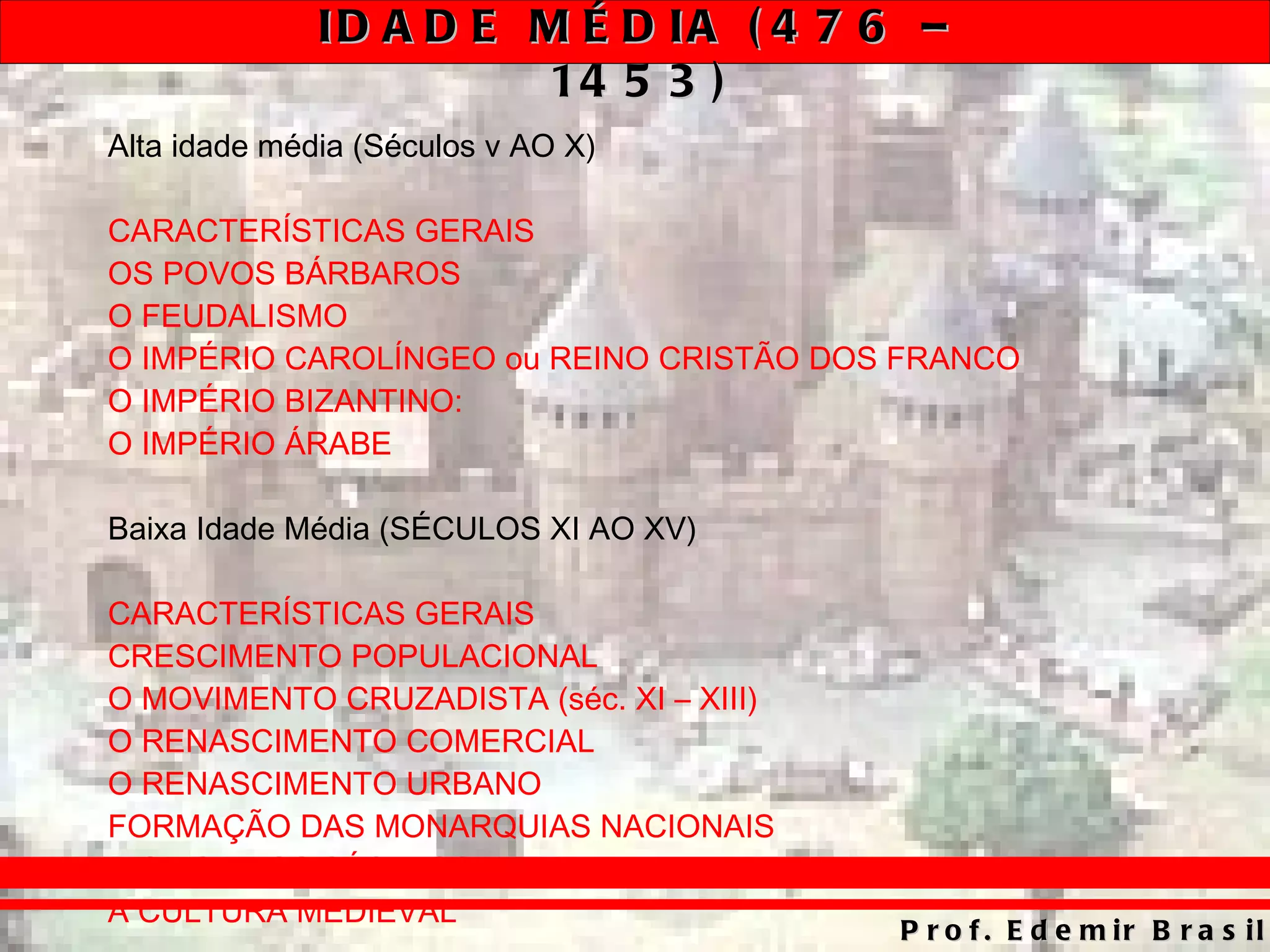 1) A Idade Média foi um período de transição entre a queda do Império Romano e o início da Idade Moderna, caracterizado pela formação do feudalismo na Europa após as invasões bárbaras.