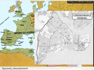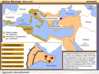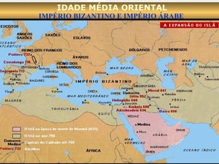 1. O documento descreve o Império Bizantino e seu auge sob Justiniano, assim como o surgimento do Império Árabe sob Maomé e sua rápida expansão territorial motivada por fatores econômicos, sociais e políticos. 2. A cultura árabe assimilou valores de outros povos e traduziu obras clássicas, fazendo avanços nas áreas da medicina, matemática, física e química. 3. Embora unidos pela religião, os muçulmanos encontram-se hoje politicamente