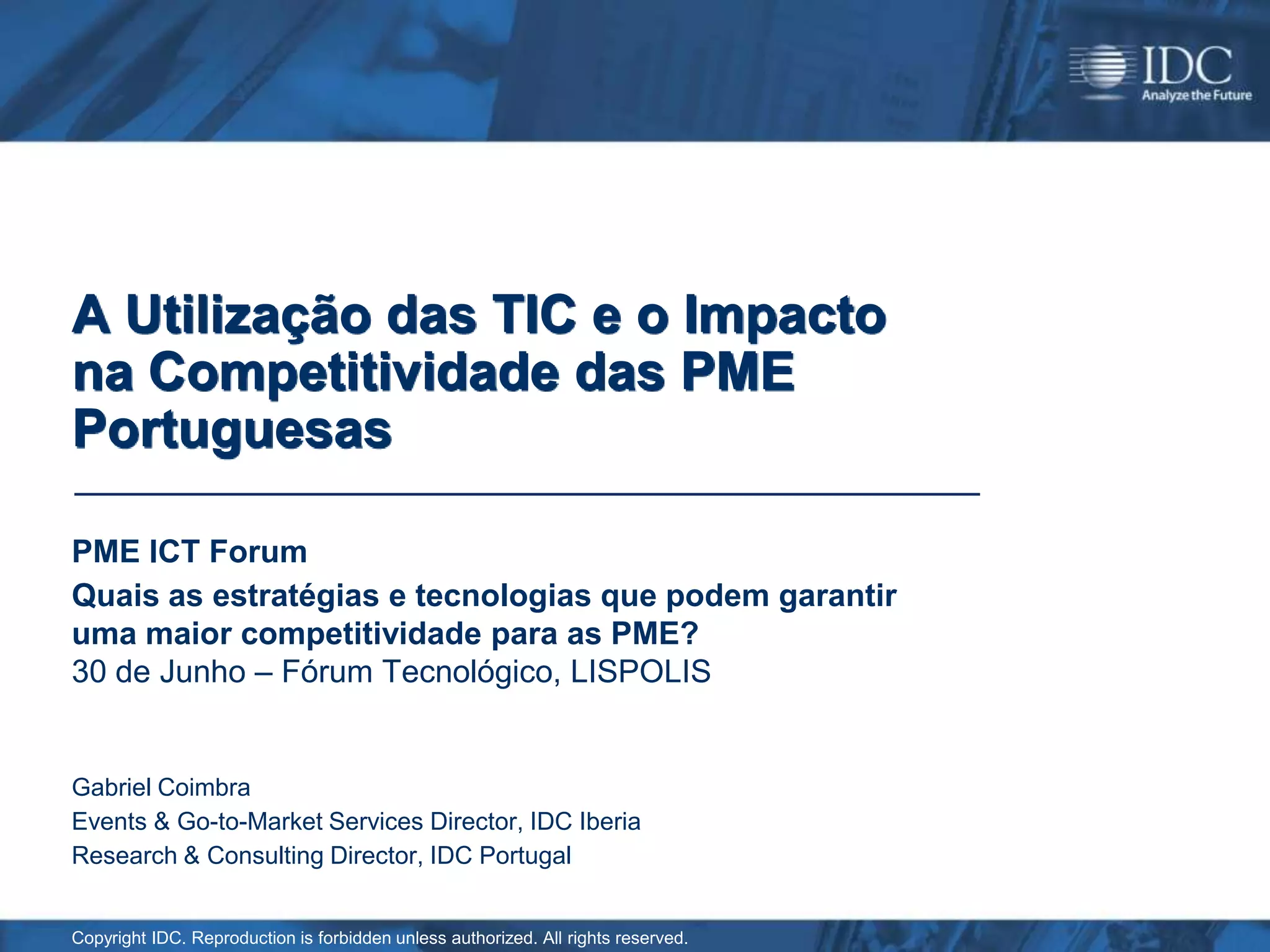 Este documento discute a utilização de tecnologias de informação e comunicação (TIC) por pequenas e médias empresas (PME) portuguesas e seu impacto na competitividade. Apresenta uma análise sobre o nível de sofisticação e propensão a investir em TIC de PMEs europeias ocidentais, agrupando-as em quatro clusters: orientados à tecnologia, seguidores, esperam para ver e retardatários. Discute também a distribuição de PMEs portuguesas entre esses clusters.