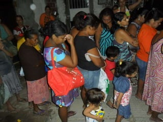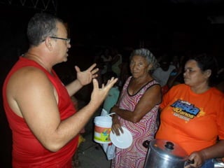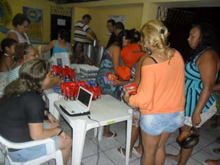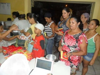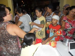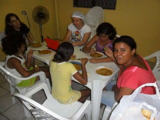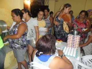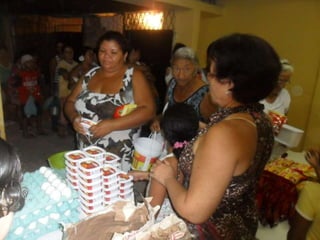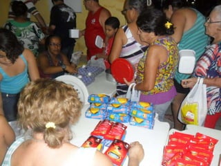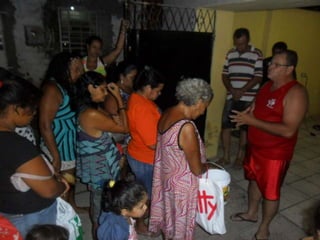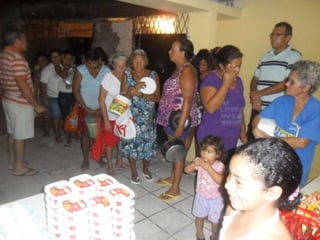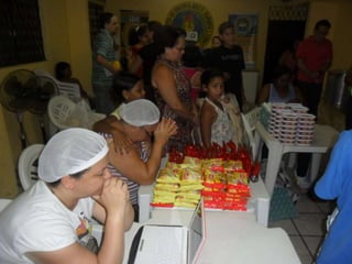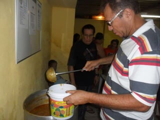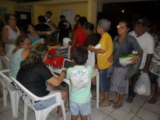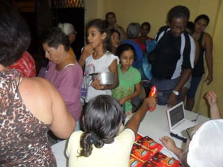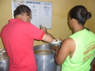O documento descreve um projeto de distribuição de refeições, fornecendo números sobre as refeições distribuídas semanalmente e mensalmente, além de contatos para doações.