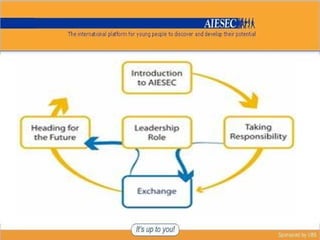 O documento descreve o fluxo ideal de aprendizagem na AIESEC, incluindo entender o papel e valores da organização, assumir responsabilidades em times, desenvolver habilidades de liderança, ter experiências internacionais e planejar o futuro após a participação na AIESEC.
