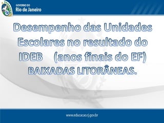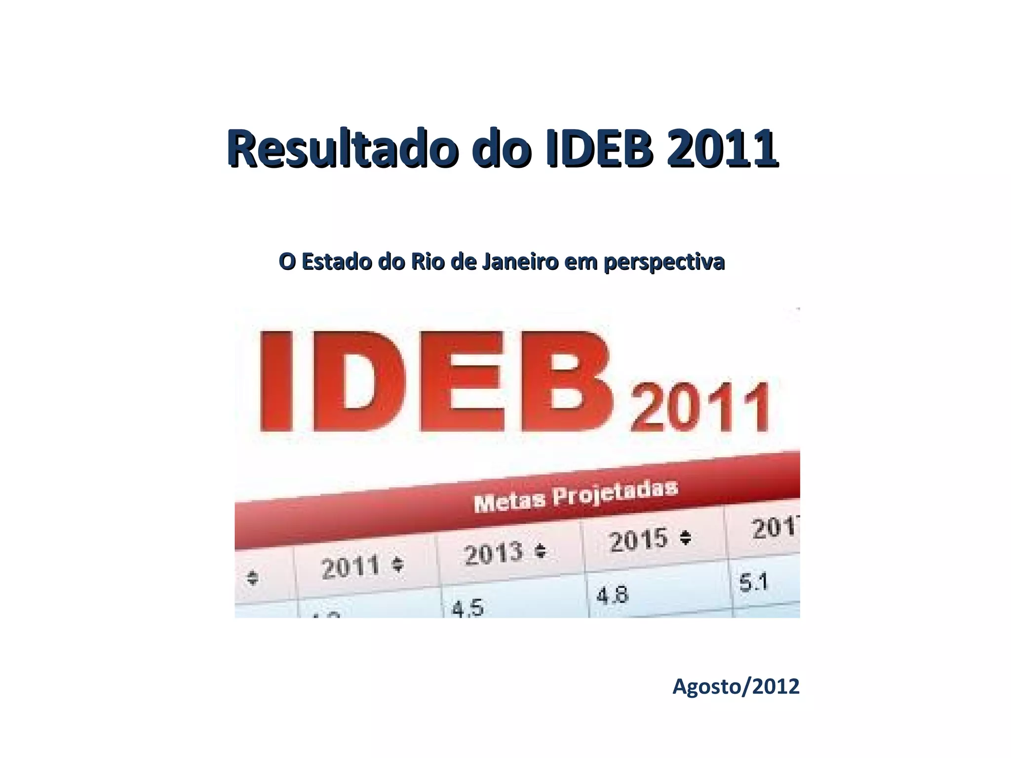 O documento resume os resultados do IDEB 2011 para o Estado do Rio de Janeiro. O Rio de Janeiro subiu 11 posições no ranking do IDEB do Ensino Médio, passando para a 15a posição. A taxa de aprovação do Rio de Janeiro melhorou significativamente entre 2009-2011, e a rede estadual teve um dos maiores crescimentos nesse indicador no Brasil. As regiões das Baixadas Litorâneas tiveram bons resultados, com alguns colégios se destacando por ultrapassarem as metas estabelecidas.